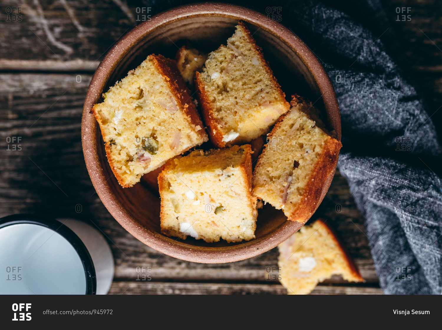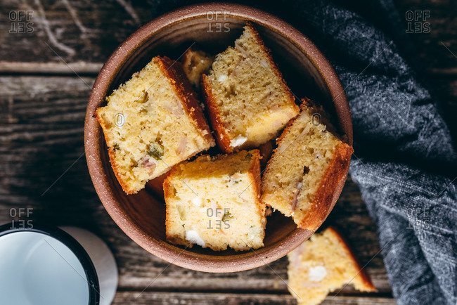 Homemade corn bread on rustic wood