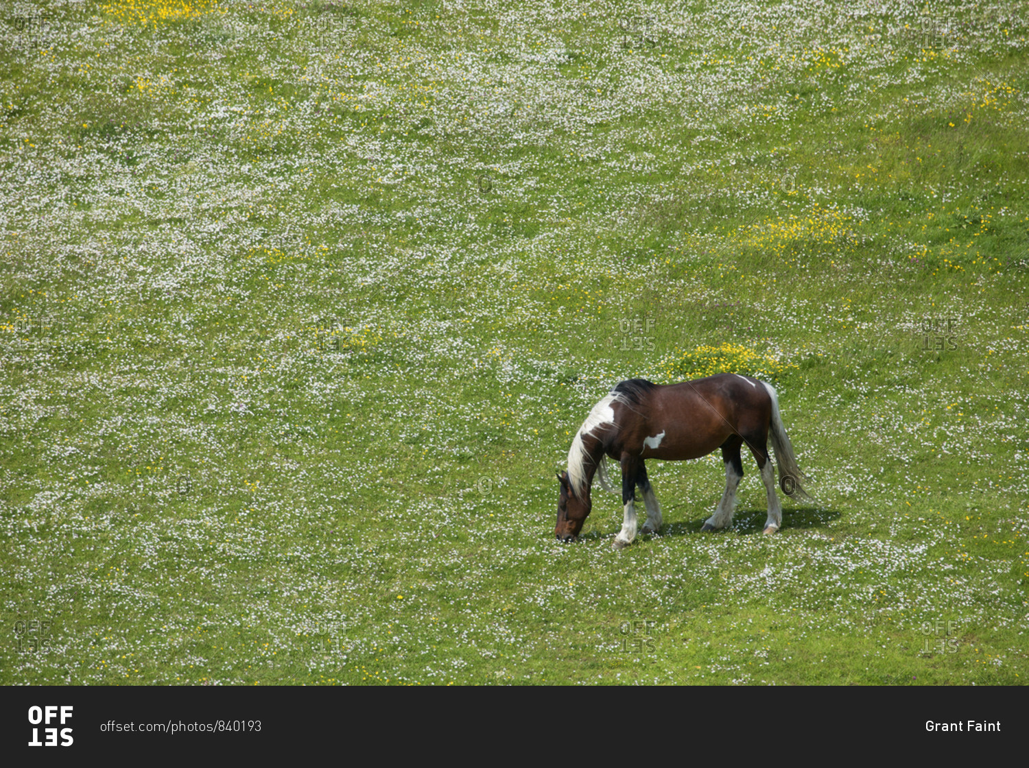 Horse grazing near Dublin airport in field of clovers in Ireland