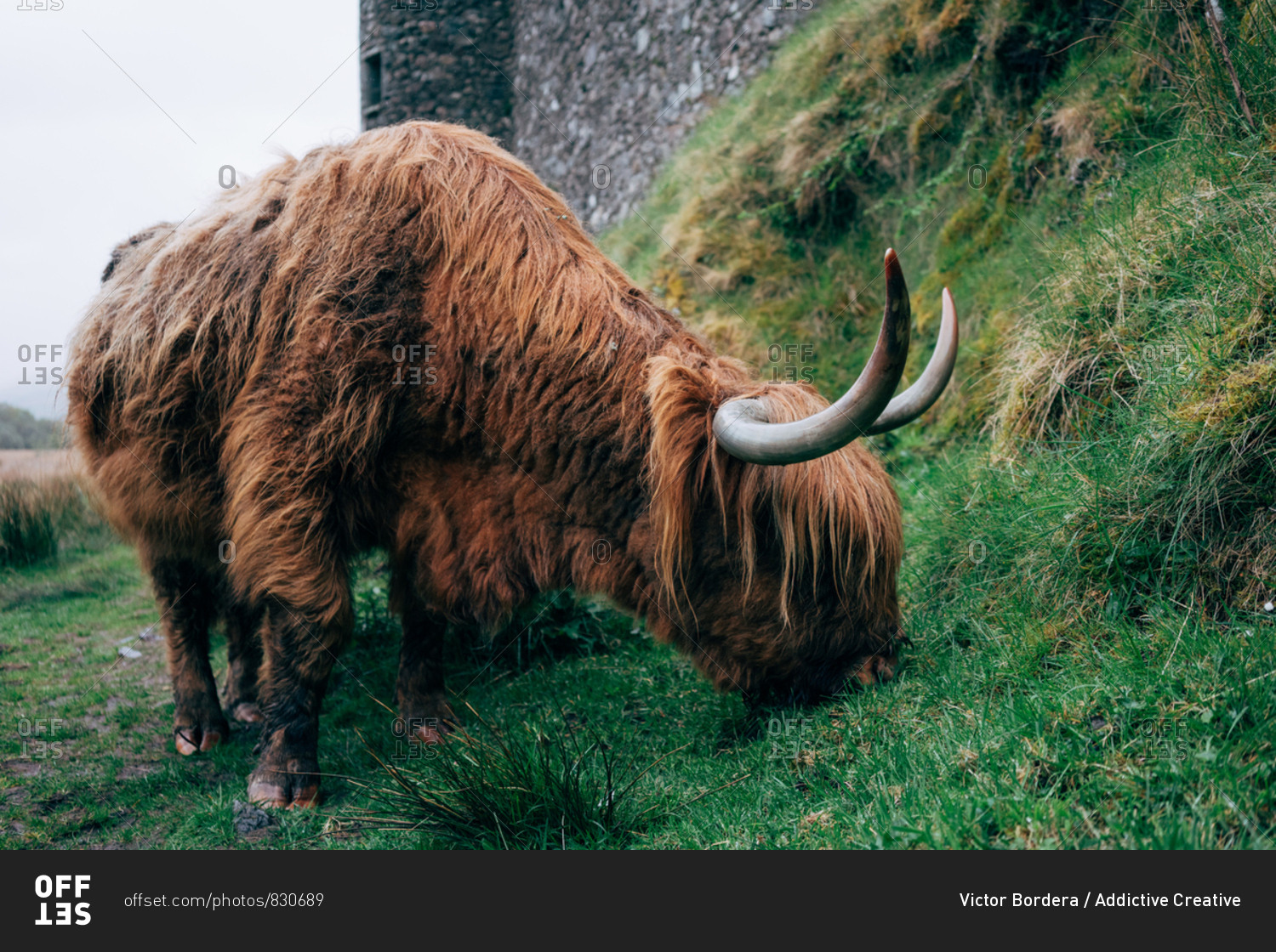 Huge ginger yak feeding on green lawn against aged stone building, Scotland
