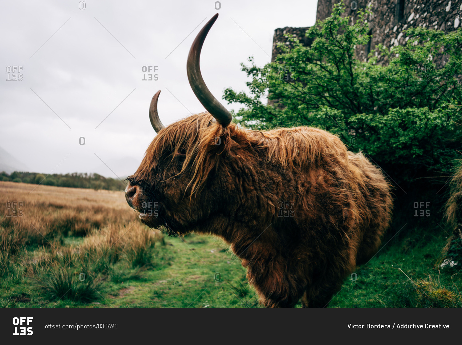 Huge ginger yak feeding on green lawn against aged stone building, Scotland