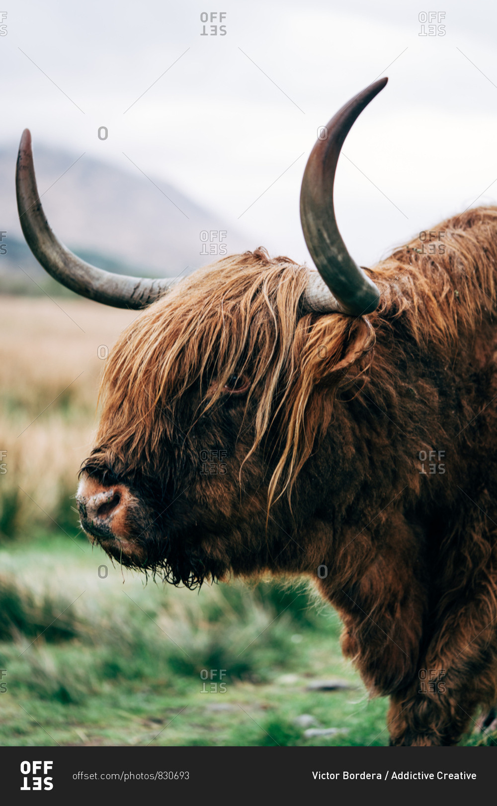 Huge ginger yak feeding on green lawn against aged stone building, Scotland