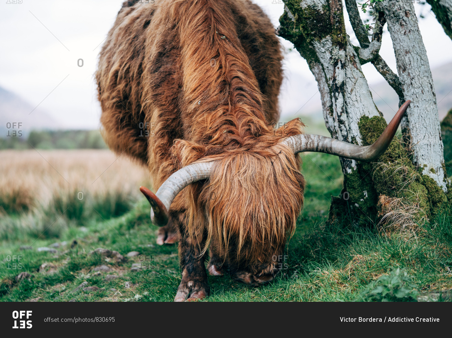 Huge ginger yak feeding on green lawn against aged stone building, Scotland