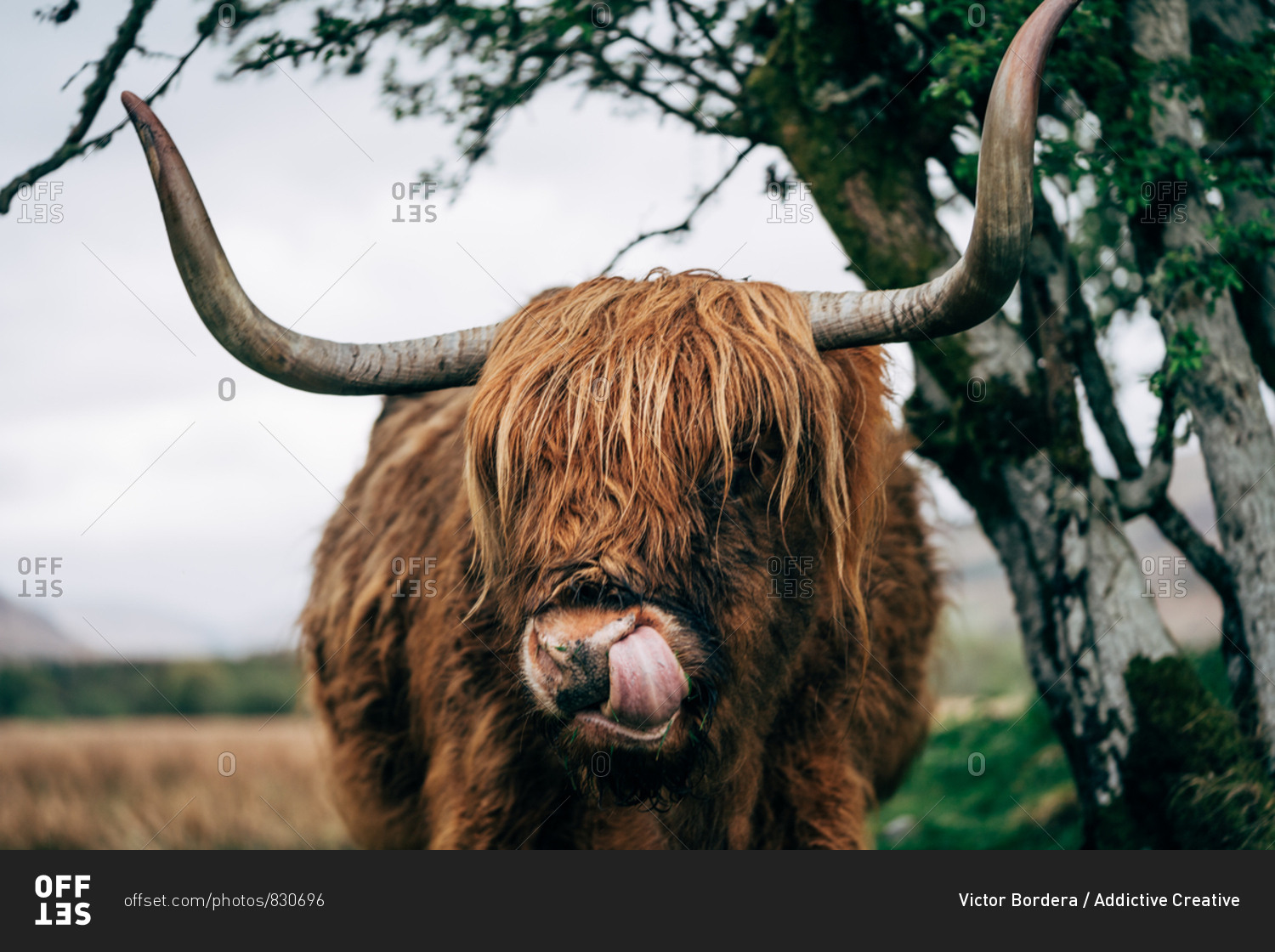 Huge ginger yak feeding on green lawn against aged stone building, Scotland