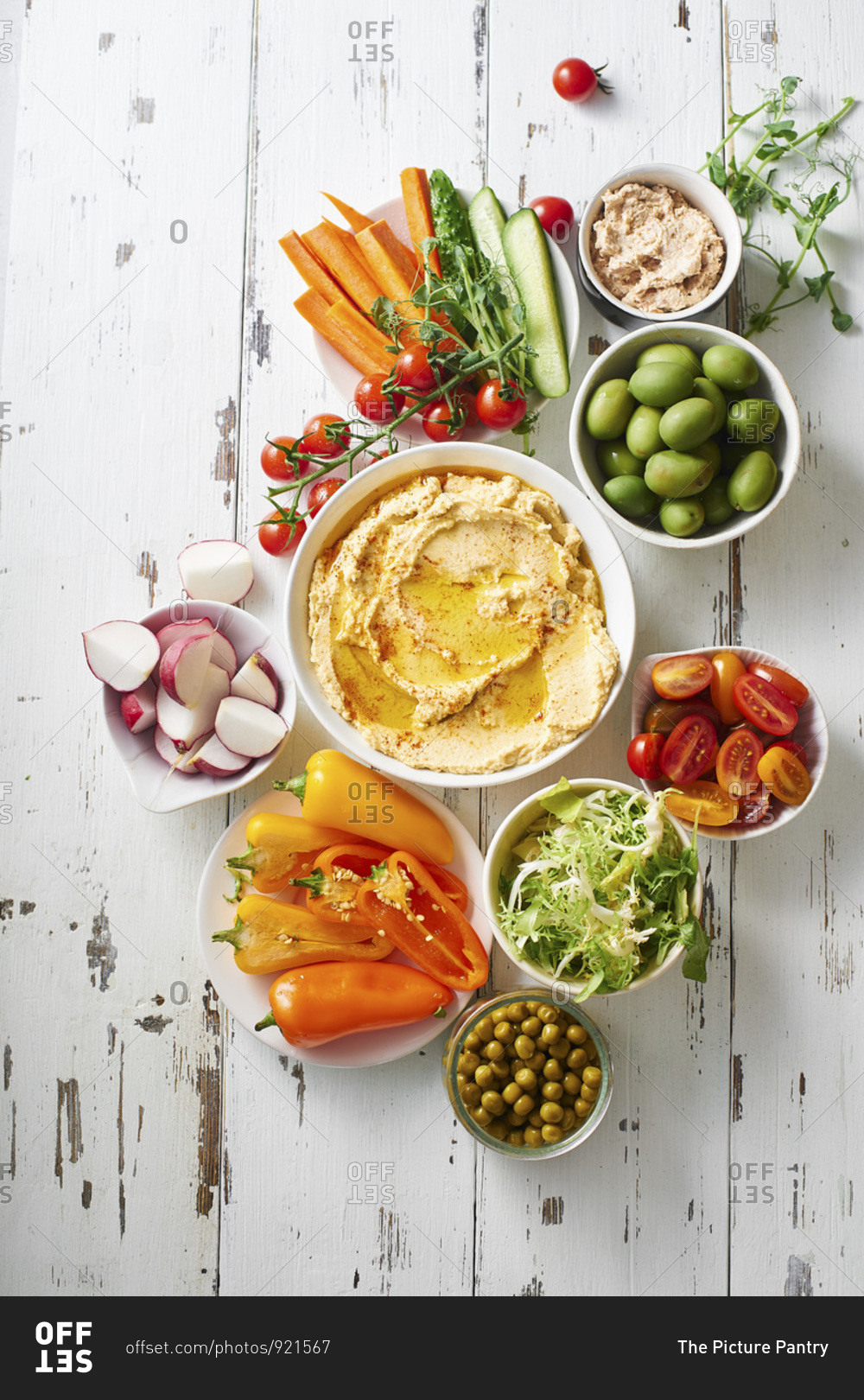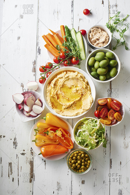Hummus dip and raw vegetarian snacks on white wooden table.