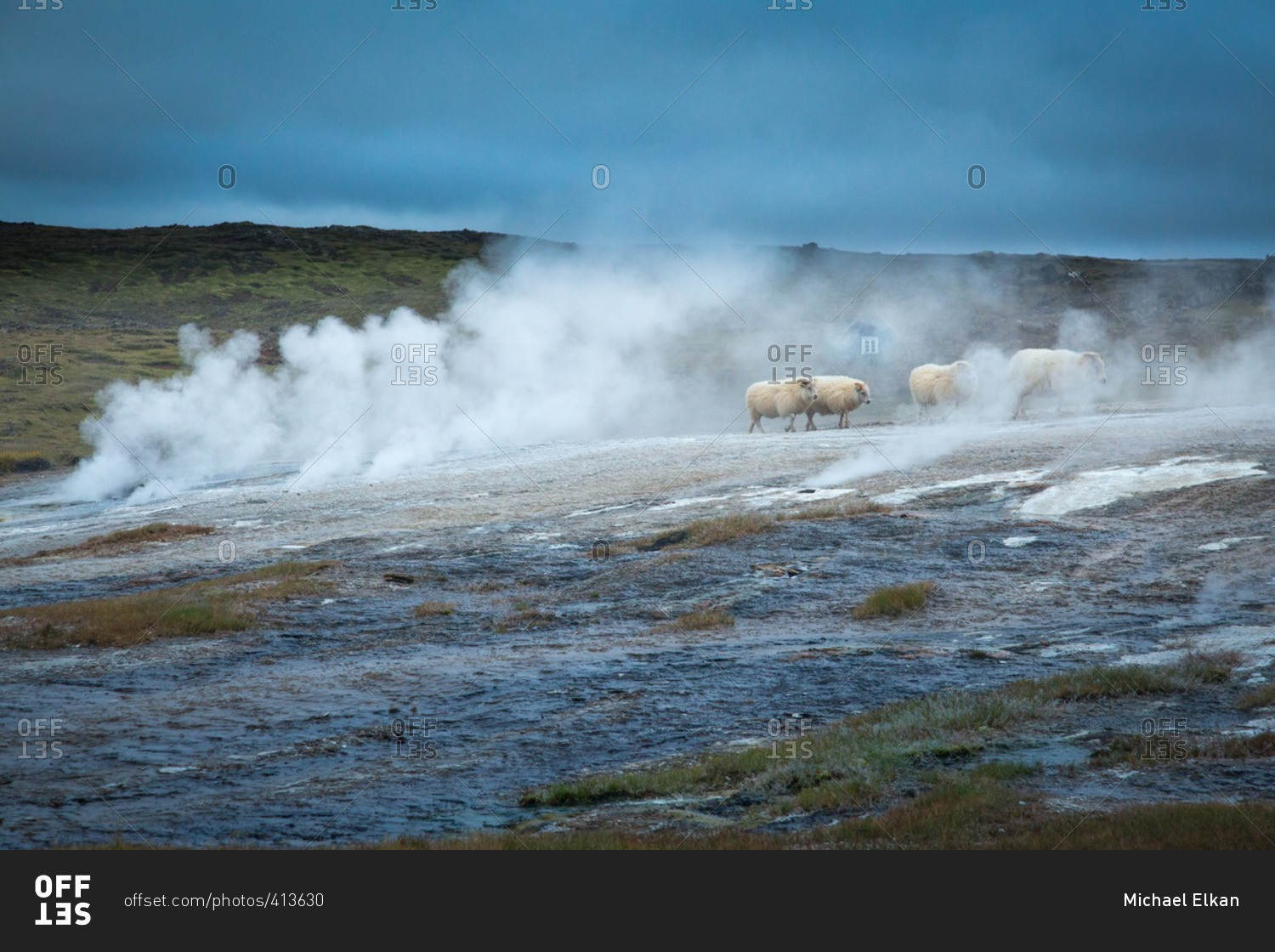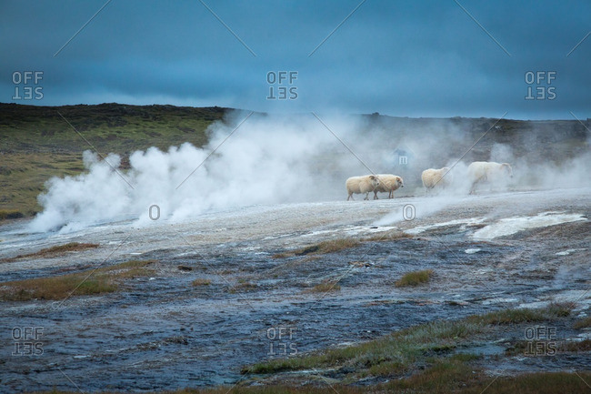 Icelandic sheep and homestead at geothermal location in the remote Kjoslur highlands