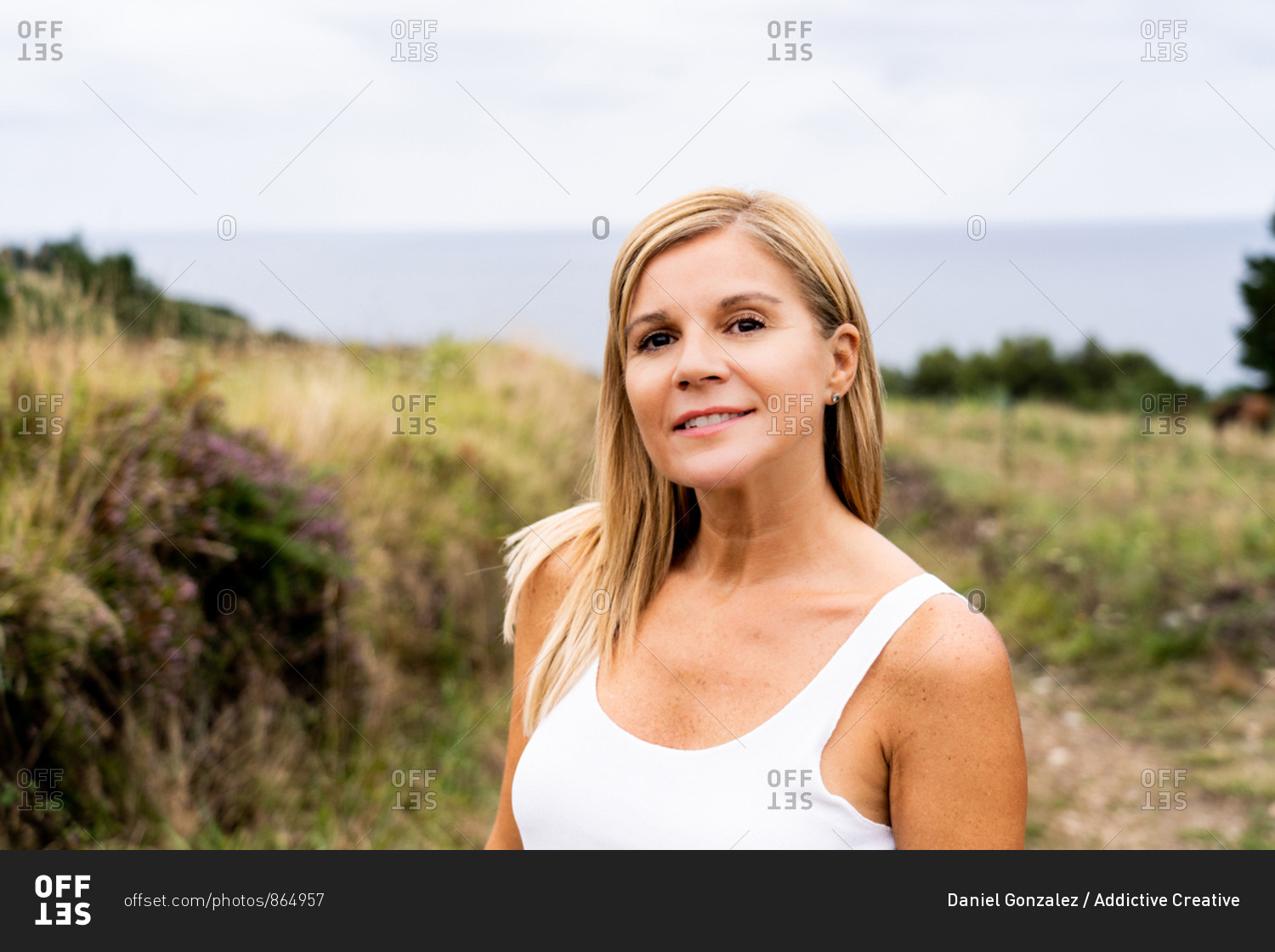 Inspired blonde woman with charming smile looking at camera while enjoying of views of countryside around