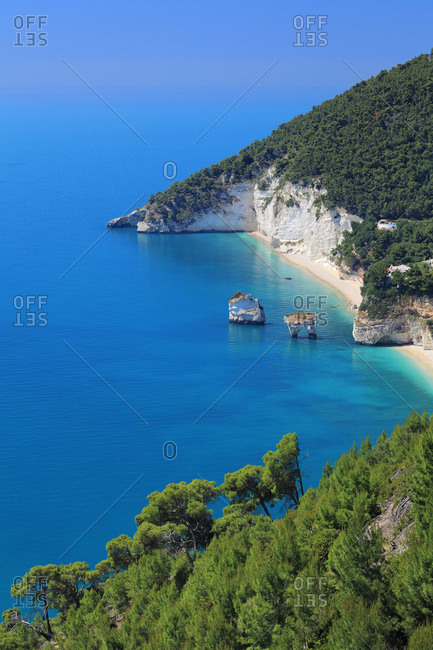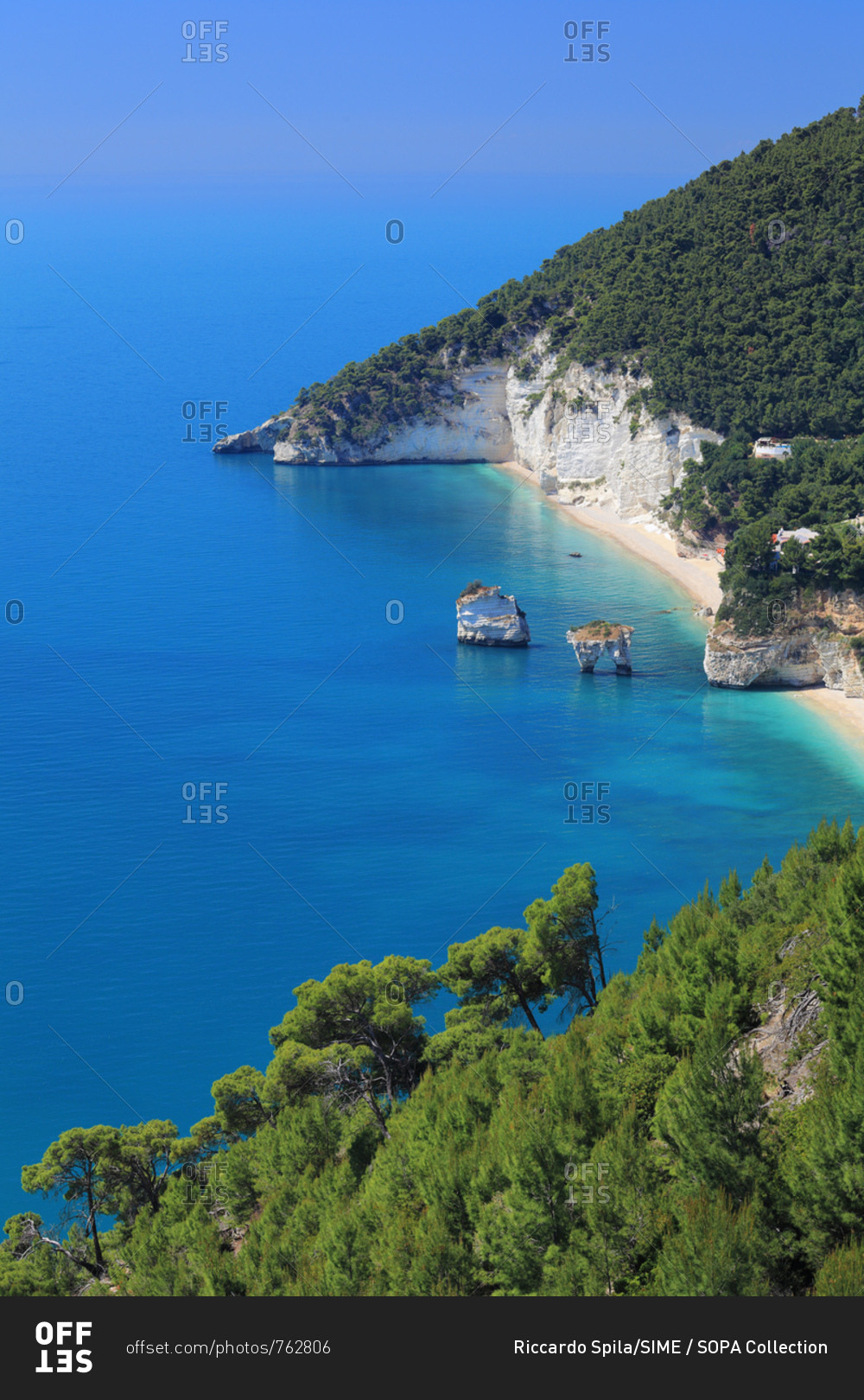 Italy, Apulia, Foggia district, Gargano, Baia delle Zagare, Mediterranean sea, Adriatic sea, Adriatic Coast, Gargano National Park, View of the iconic bay and beach with its sea stacks and natural arch