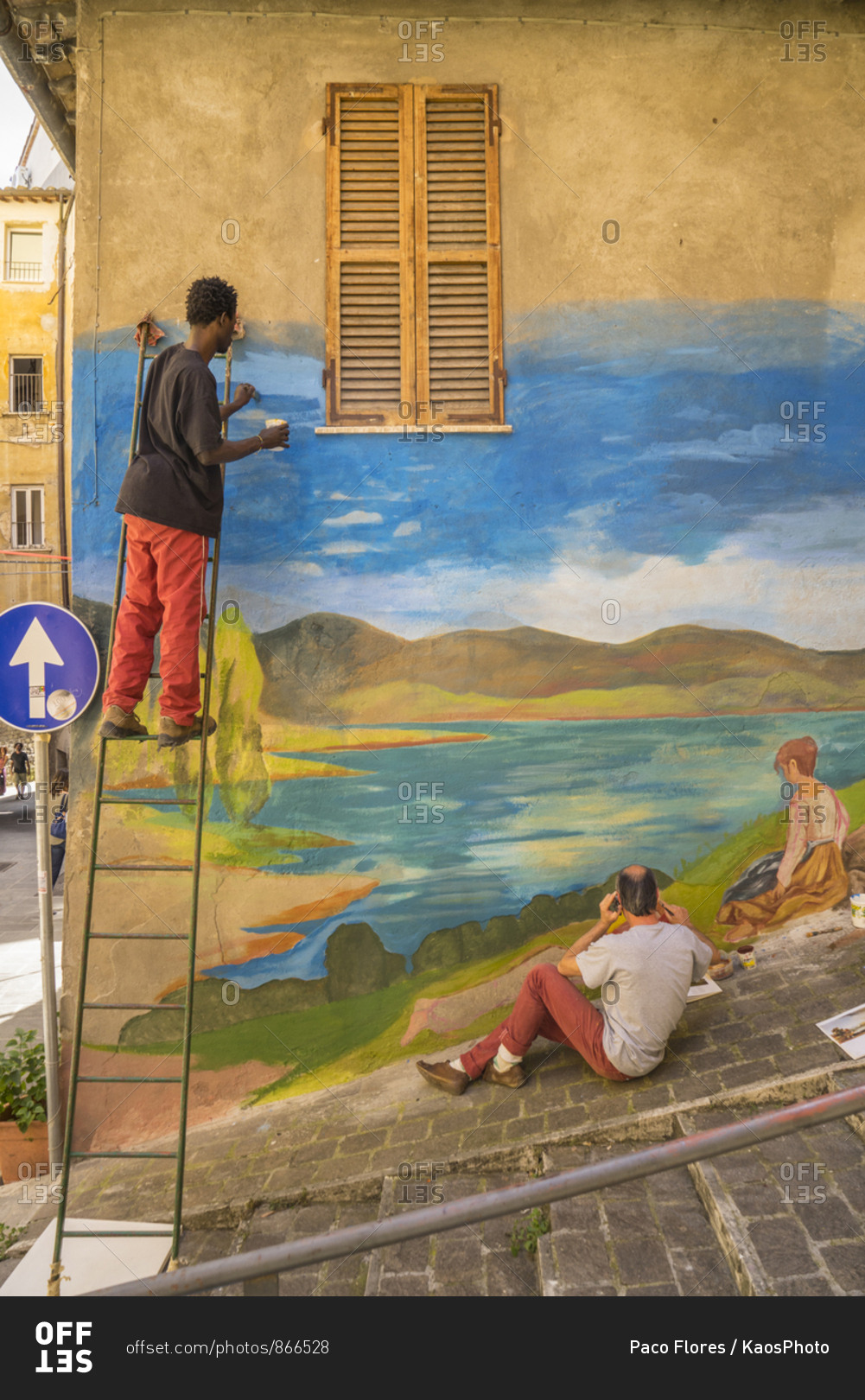 June 18, 2016: Italy, Umbria, Perugia . Via della Viola during "Alkemika" street art festival. Artist painting a wall murales inspired by peace and harmony