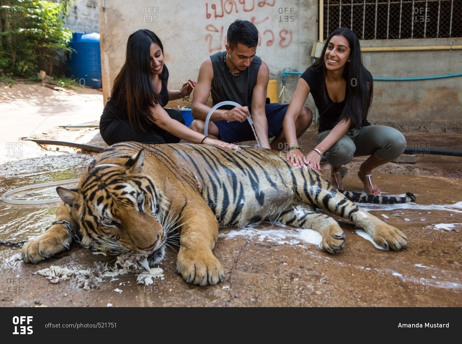 Kanchanaburi, Thailand - May 10, 2015: People washing tiger as it eats