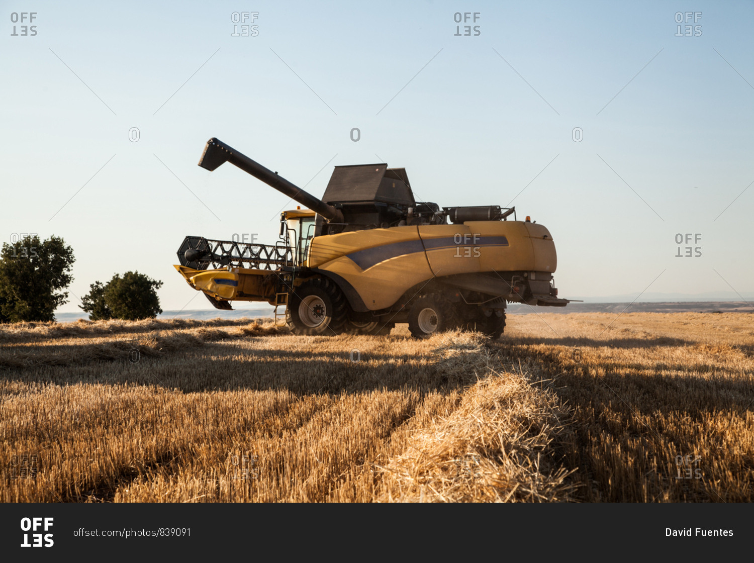 Large harvester in a barley field on a bright day