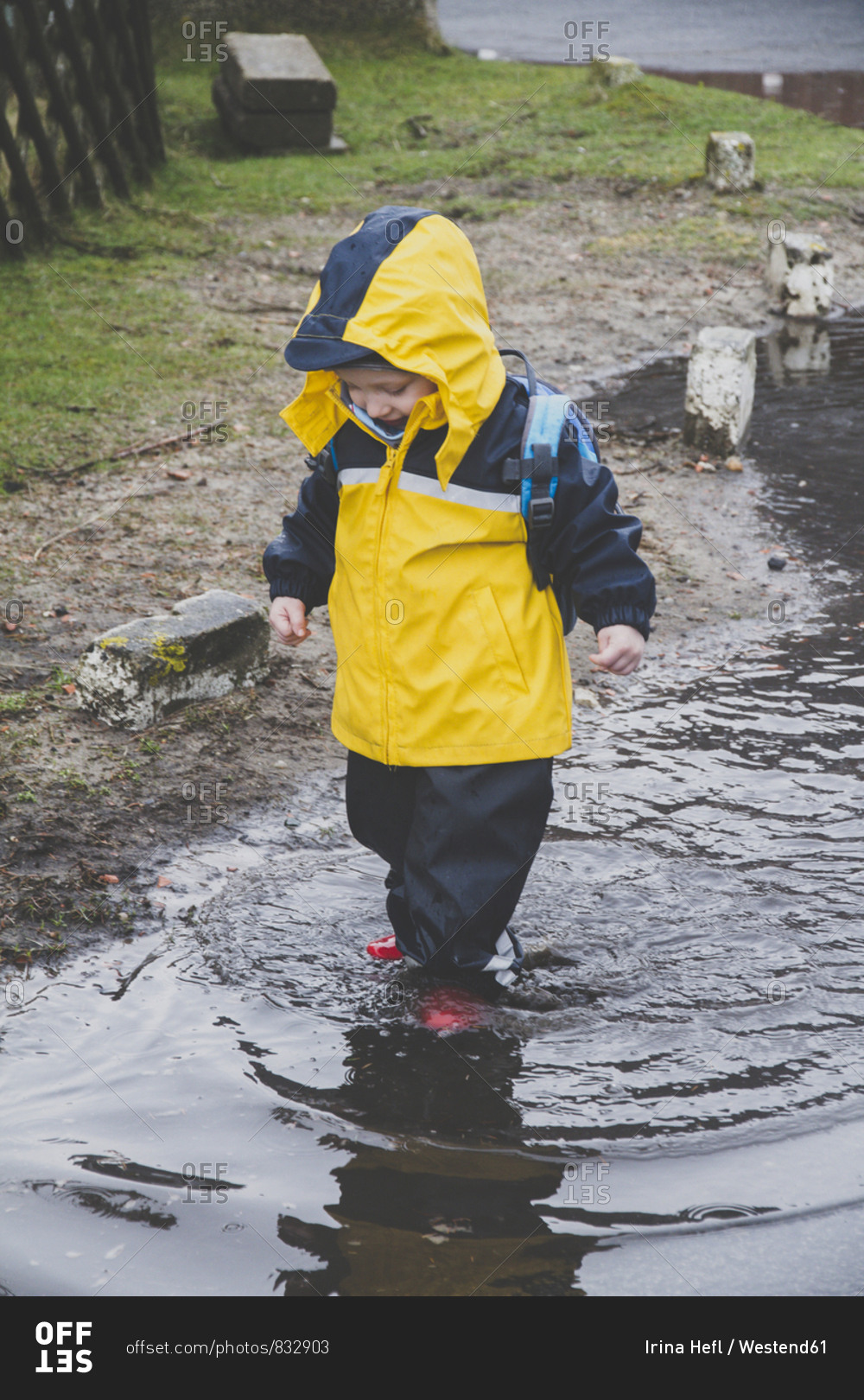 Little boy in a rainsuit exploring a puddle- Sylt- Germany
