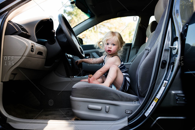 Little girl sitting in front seat of car