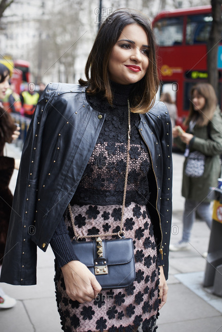 London, UK - February 21, 2017: Three quarter length view of fashionable woman wearing a black lace dress with leather jacket over her shoulders and a Valentino cross body handbag standing the street, London Fashion Week, day five.