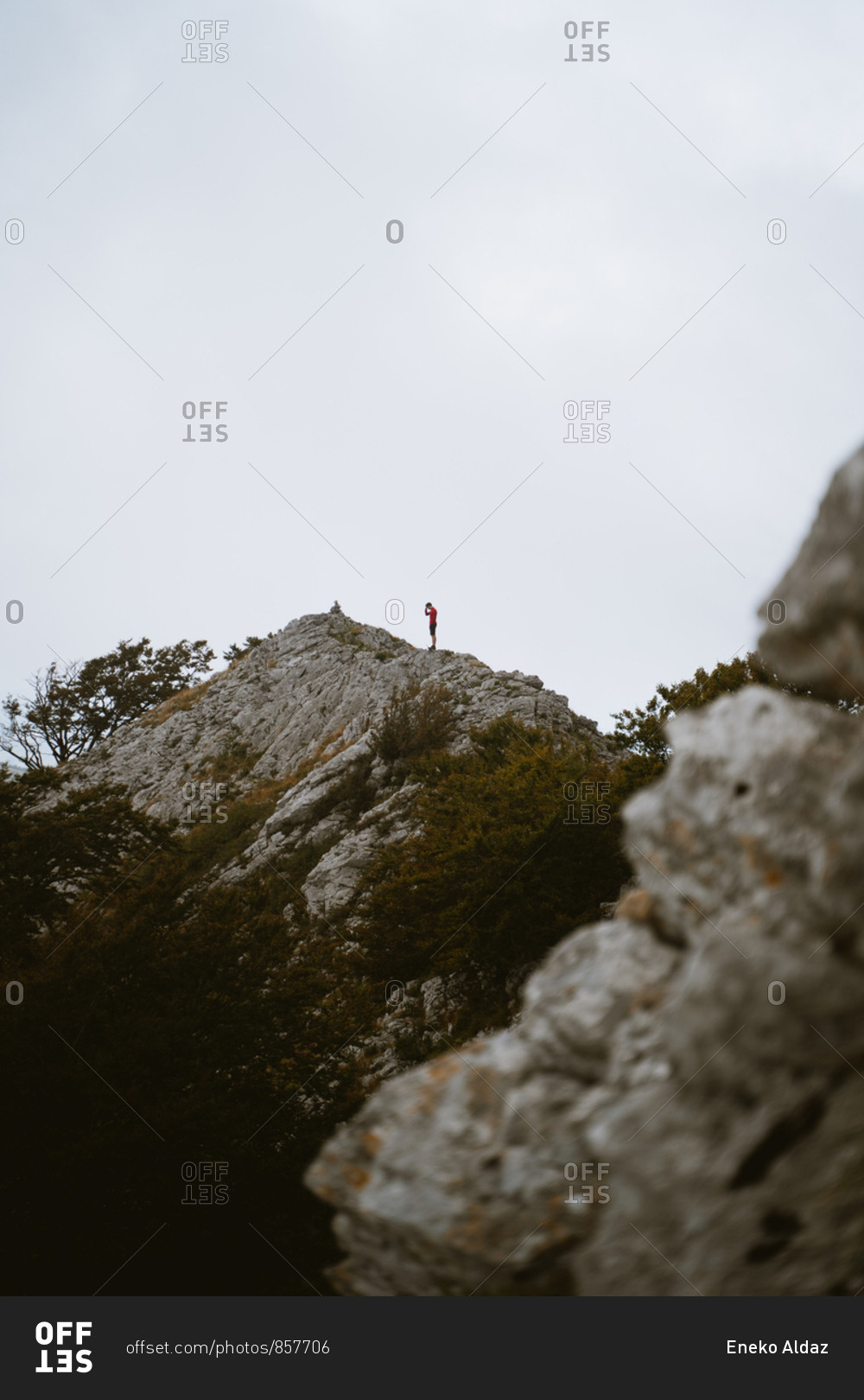 Lonely hiker meditating before reaching the top of a mountain on a foggy day
