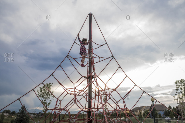 Low angle view of carefree girl playing on outdoor play equipment against stormy clouds at playground