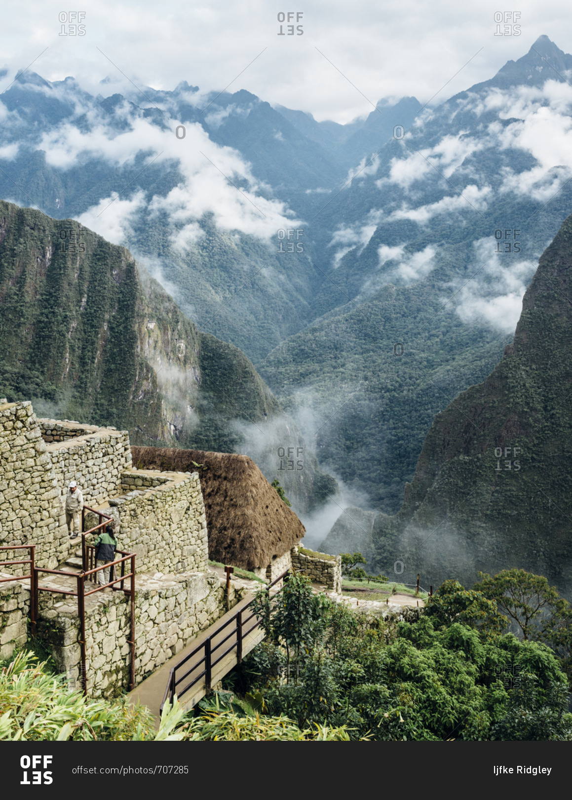 Machu Picchu, Peru - November 20, 2017: Tourism walking up stone steps in Andes mountains