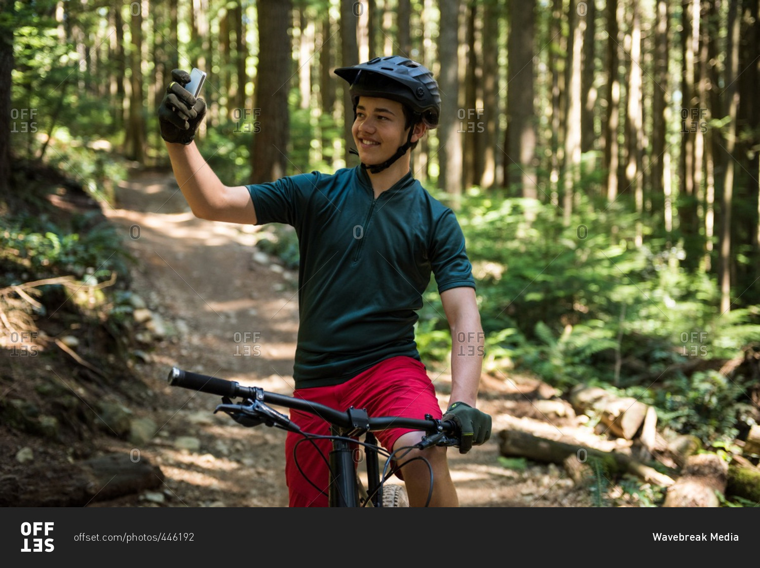 Male cyclist taking selfie on mobile phone in forest