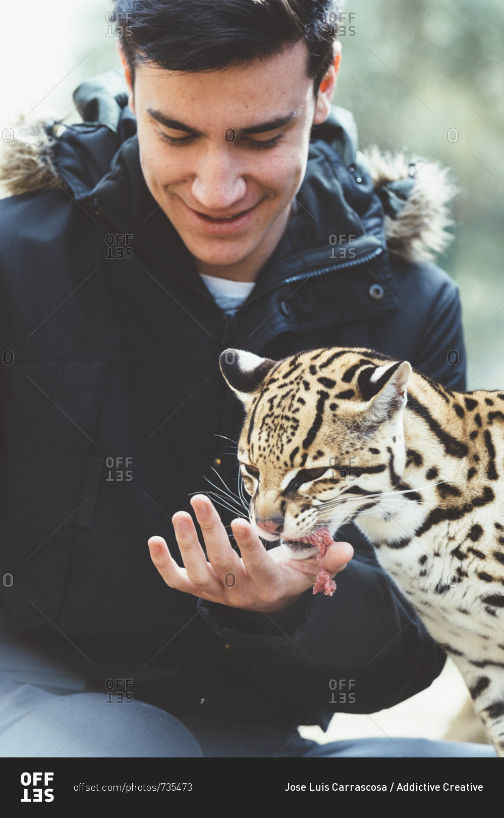 Man feeding leopard in zoo