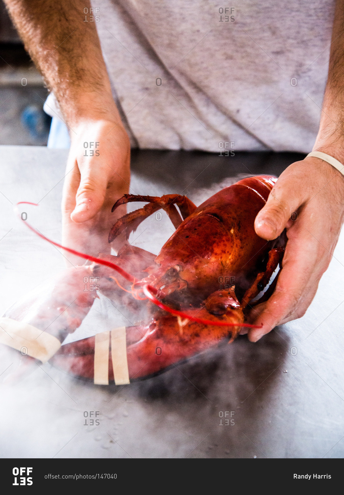 Man preparing a steaming lobsters on a countertop