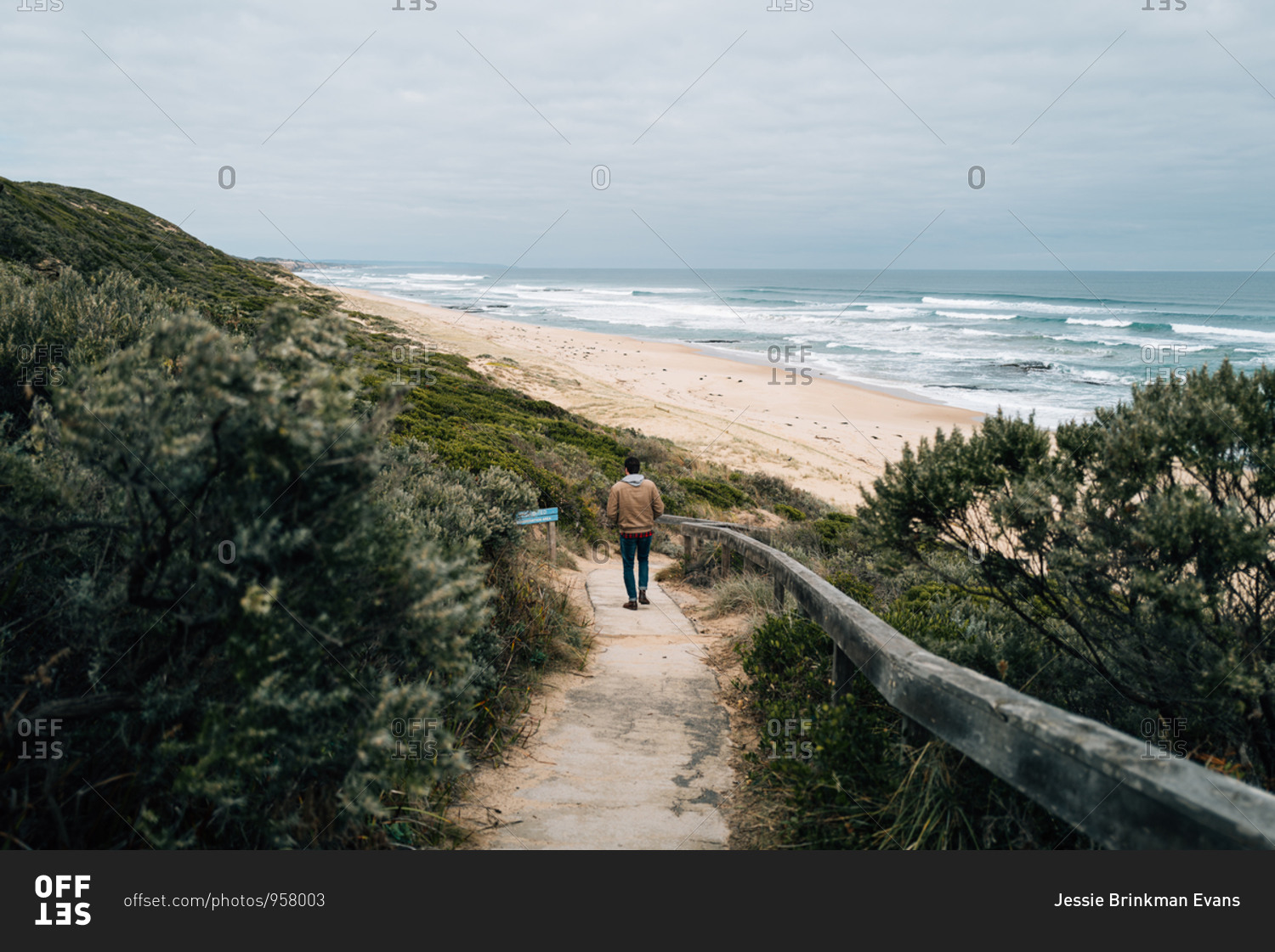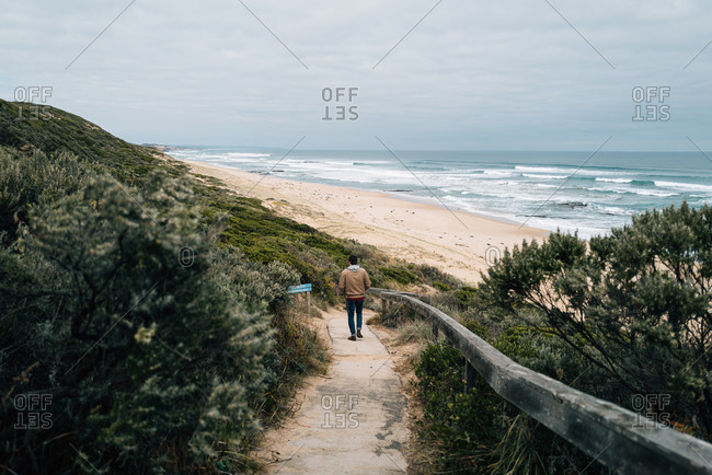 Man walking down path towards a beach on a cloudy day