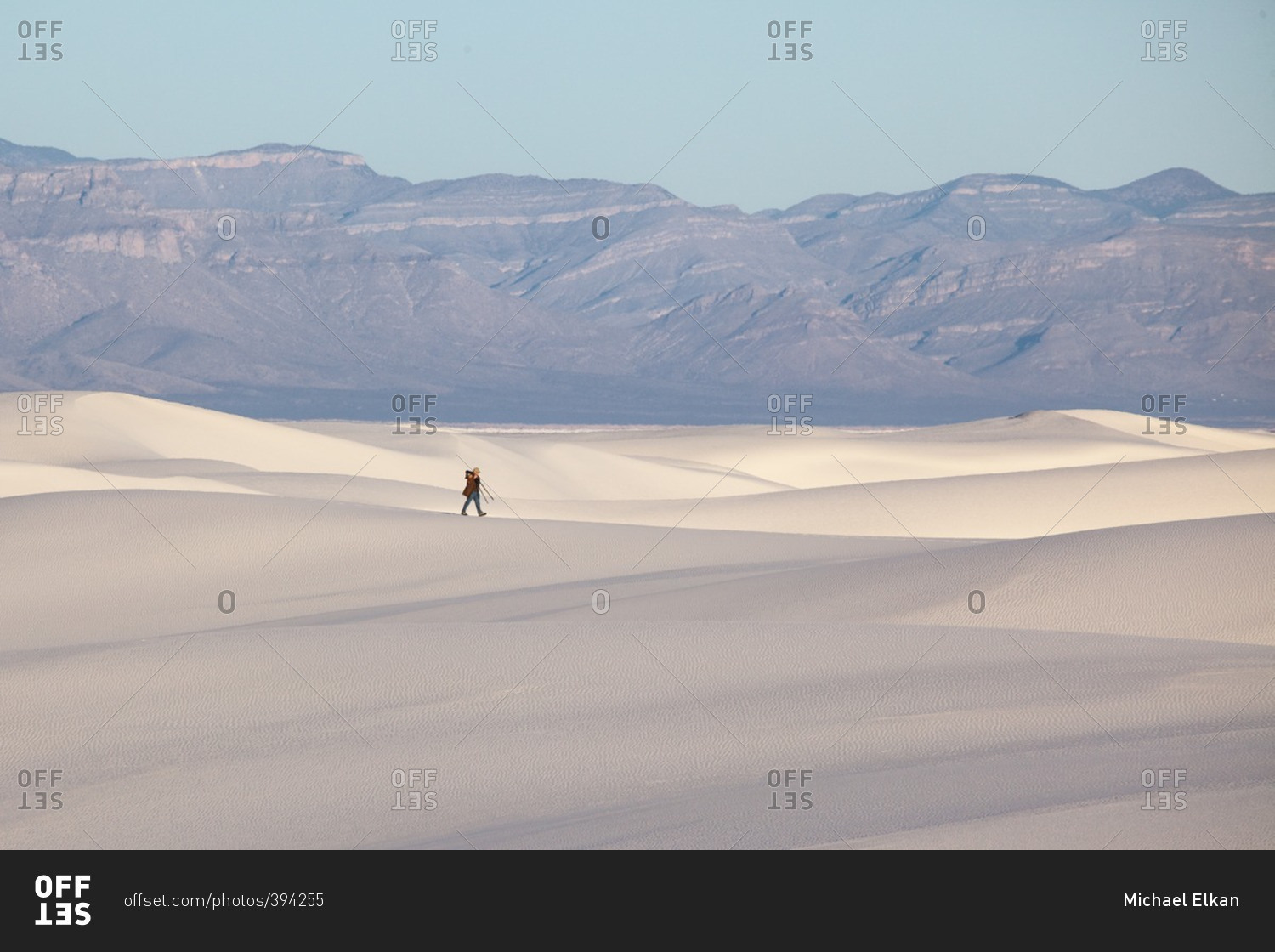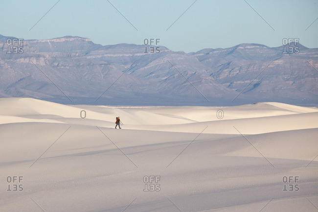 Man walking with a tripod on dunes in White Sands National Monument