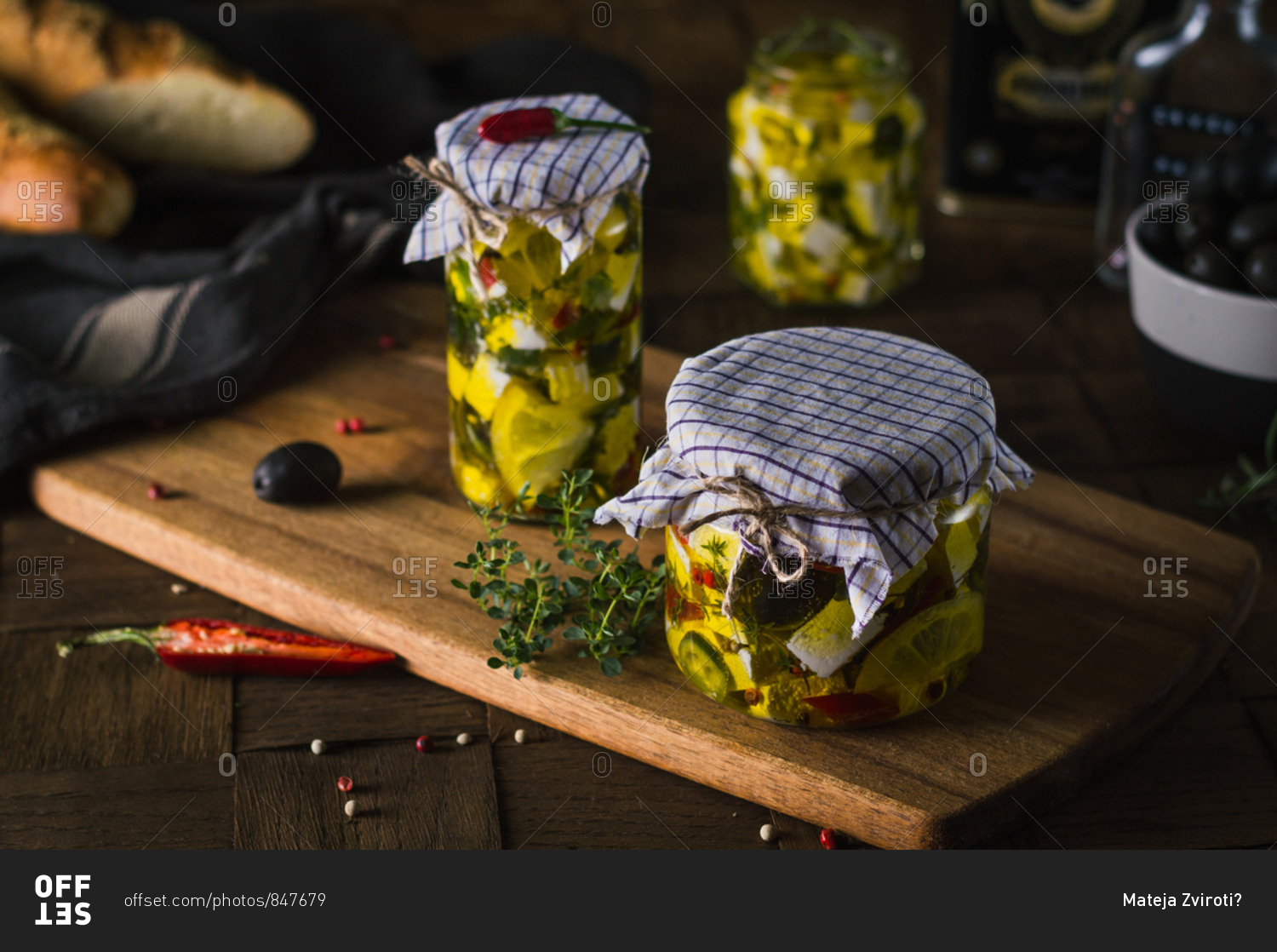 Marinated goat cheese with fresh herbs, spices and chili peppers in olive oil