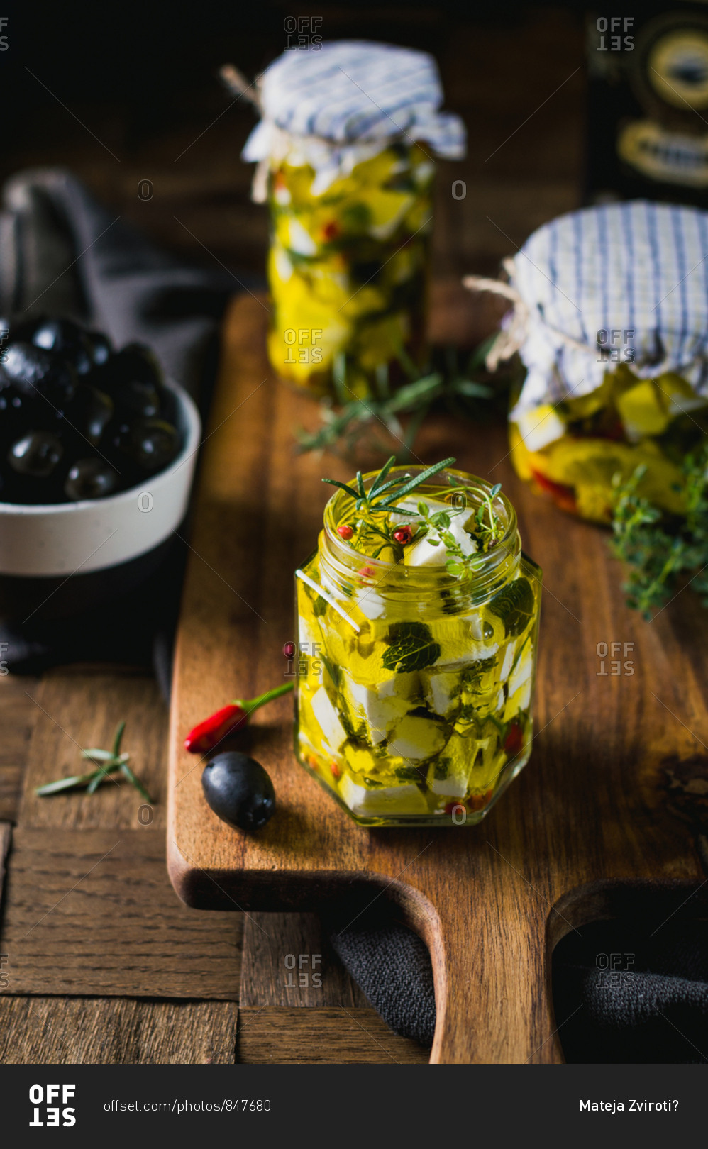 Marinated goat cheese with fresh herbs, spices and chili peppers in olive oil