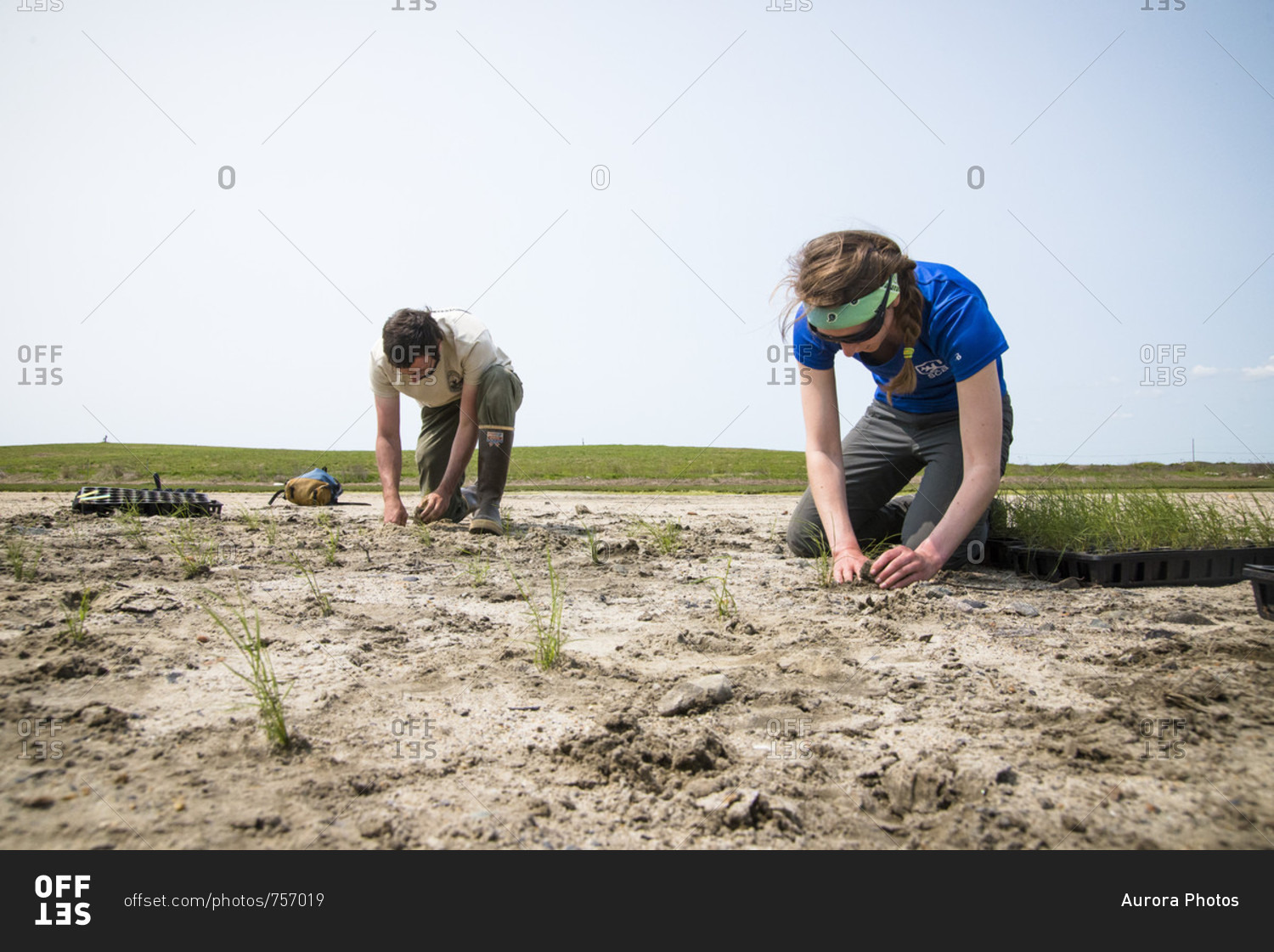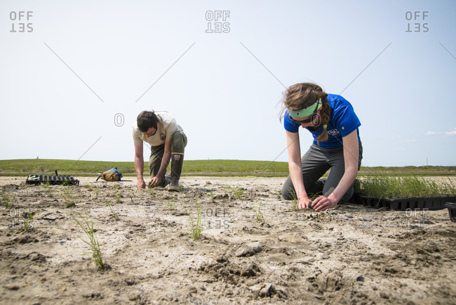 May 20, 2016: Volunteers planting plants during salt marsh restoration program as part of Save the Bay, Middletown, Rhode Island, USA