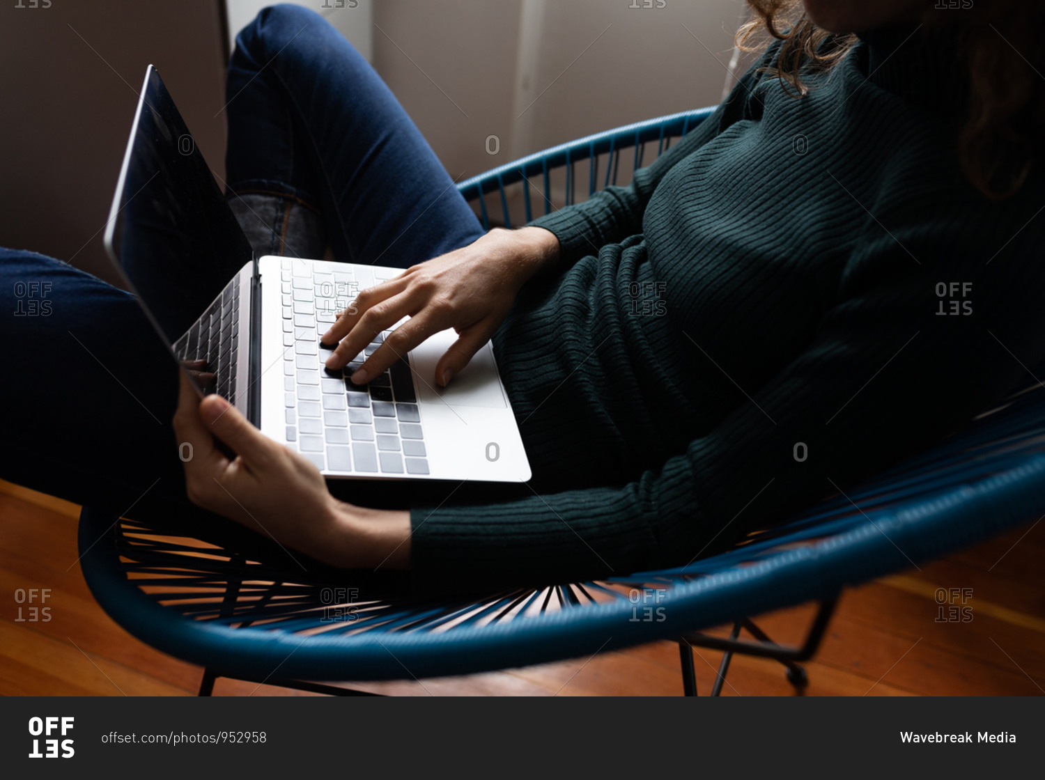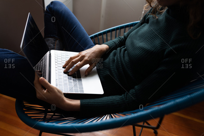 Mid section of a Caucasian woman spending time at home, sitting on a chair and using her laptop. Social distancing and self isolation in quarantine lockdown.
