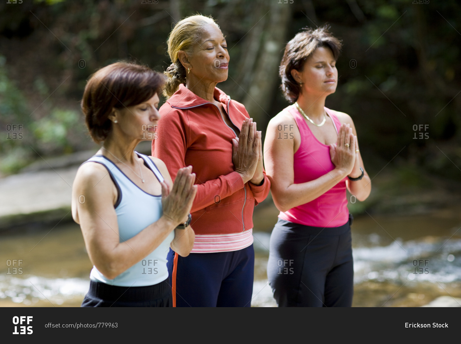 Middle aged women doing yoga beside river