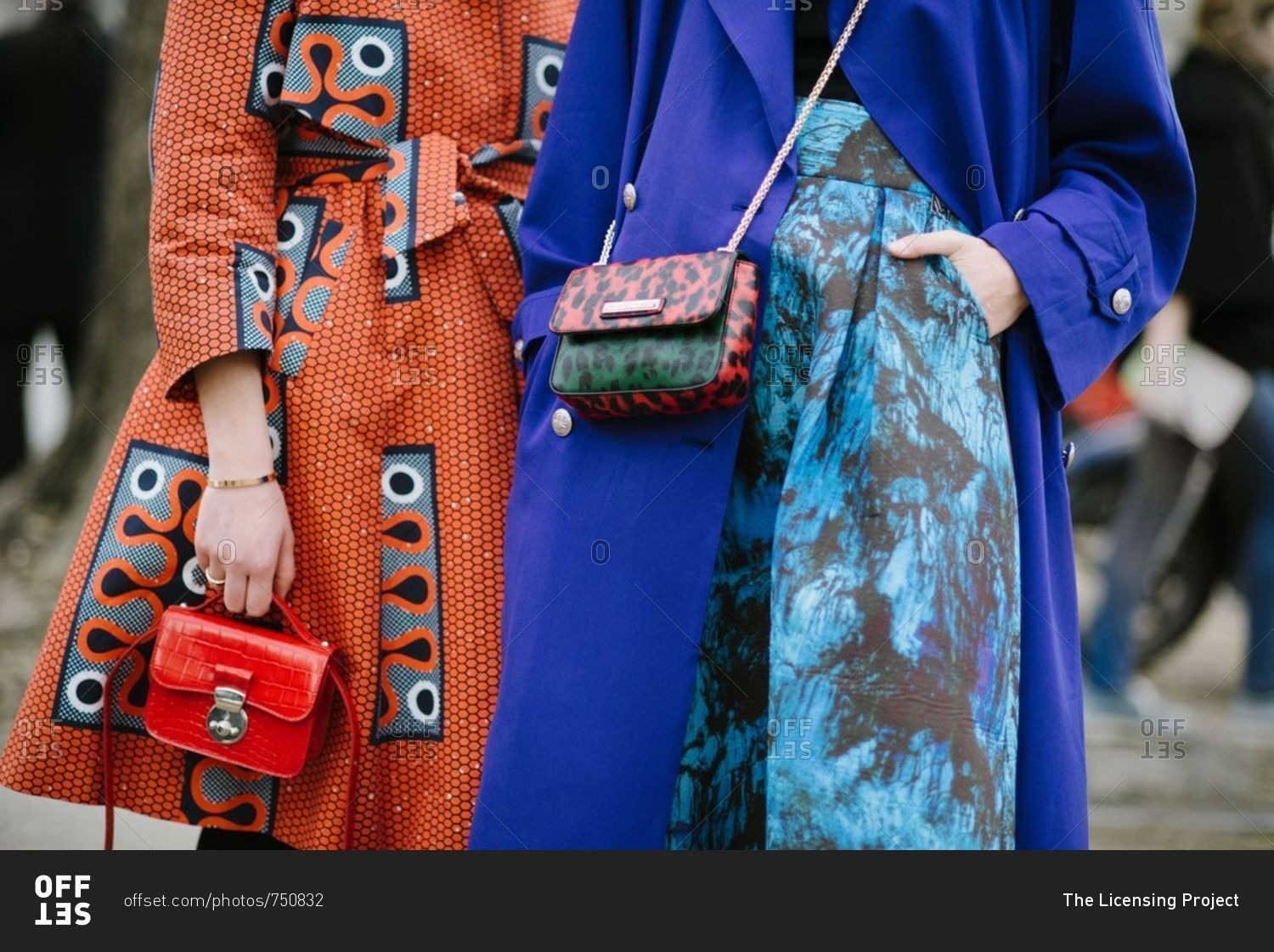 Milan, Italy - February 25, 2015: Two stylish women wearing colorful jackets
