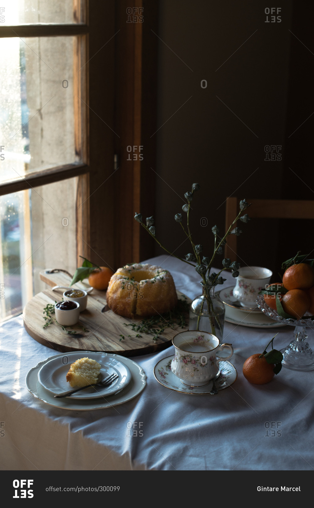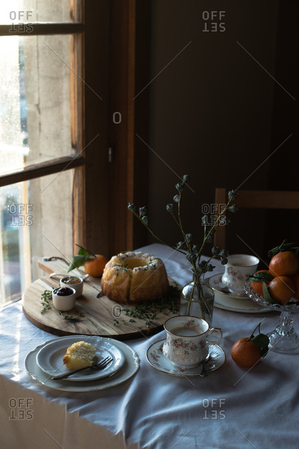 Miniature cake on a table decorated with oranges