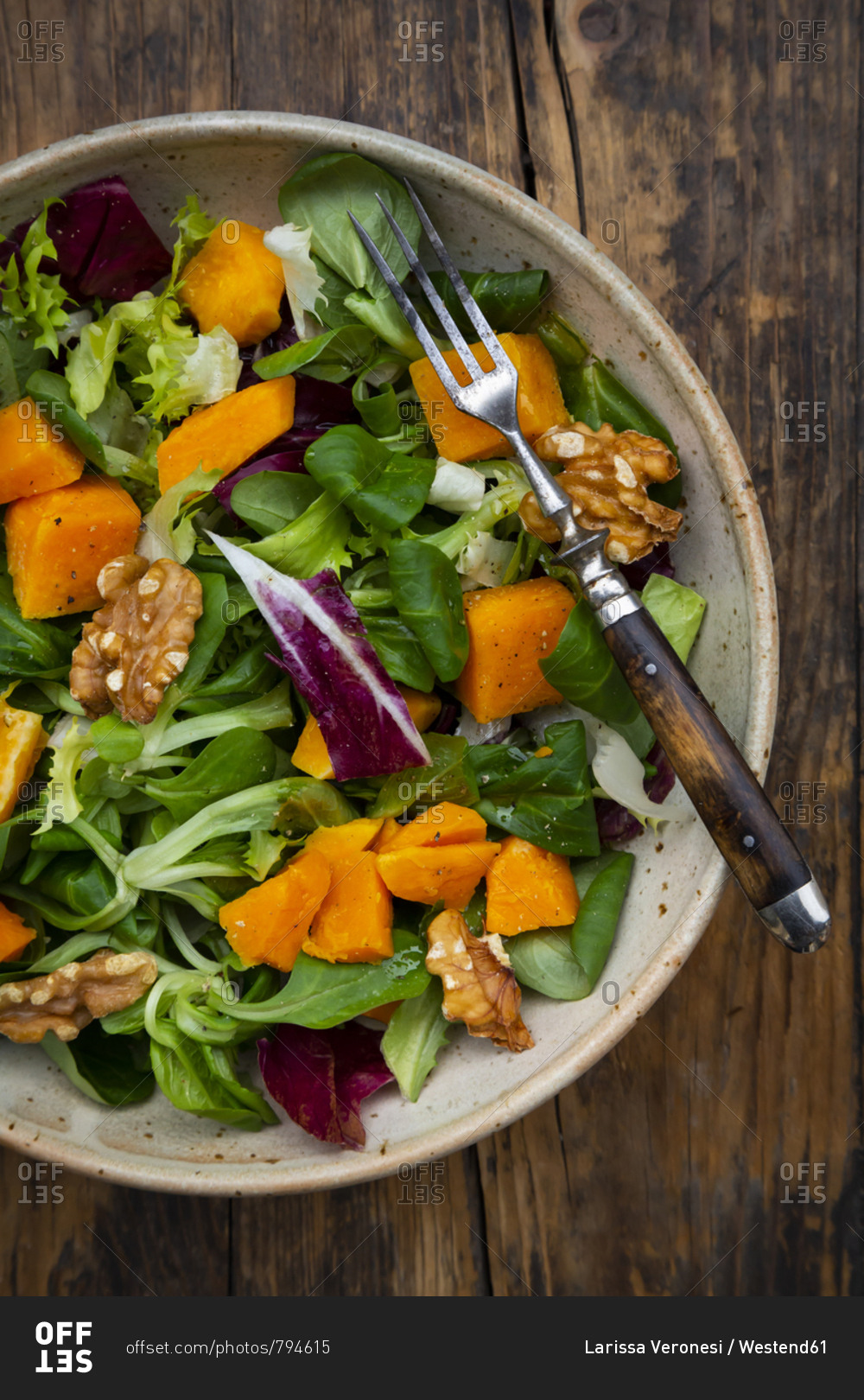 Mixed green salad with hokkaido pumpkin and walnut