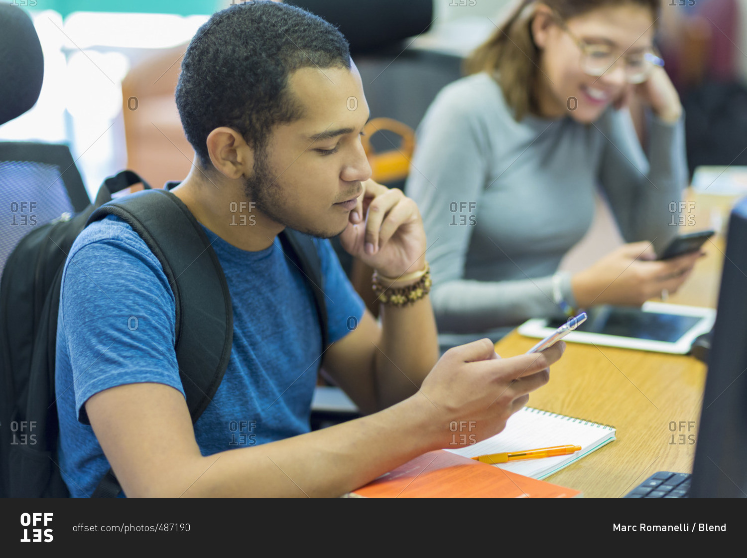 Mixed Race boy and girl texting on cell phones in library