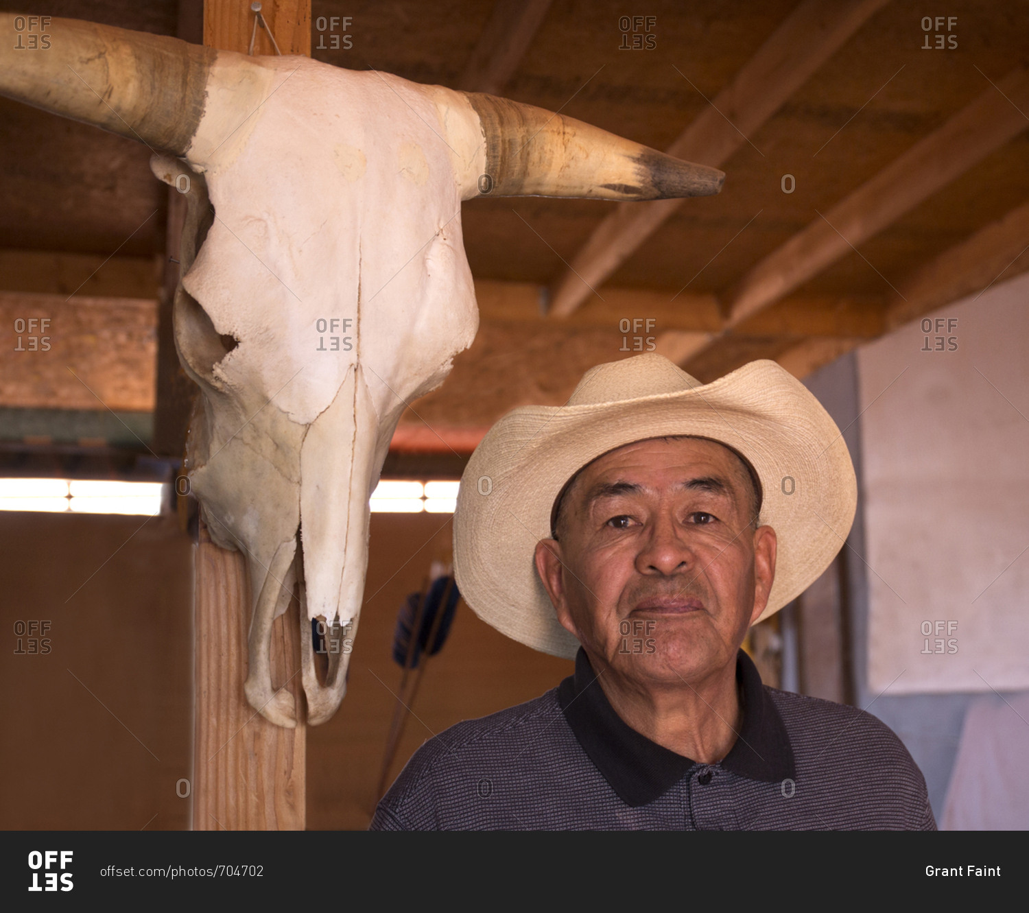 Monument Valley, Utah, USA - May 6, 2018: Portrait of a Navajo man standing next to a cow skull