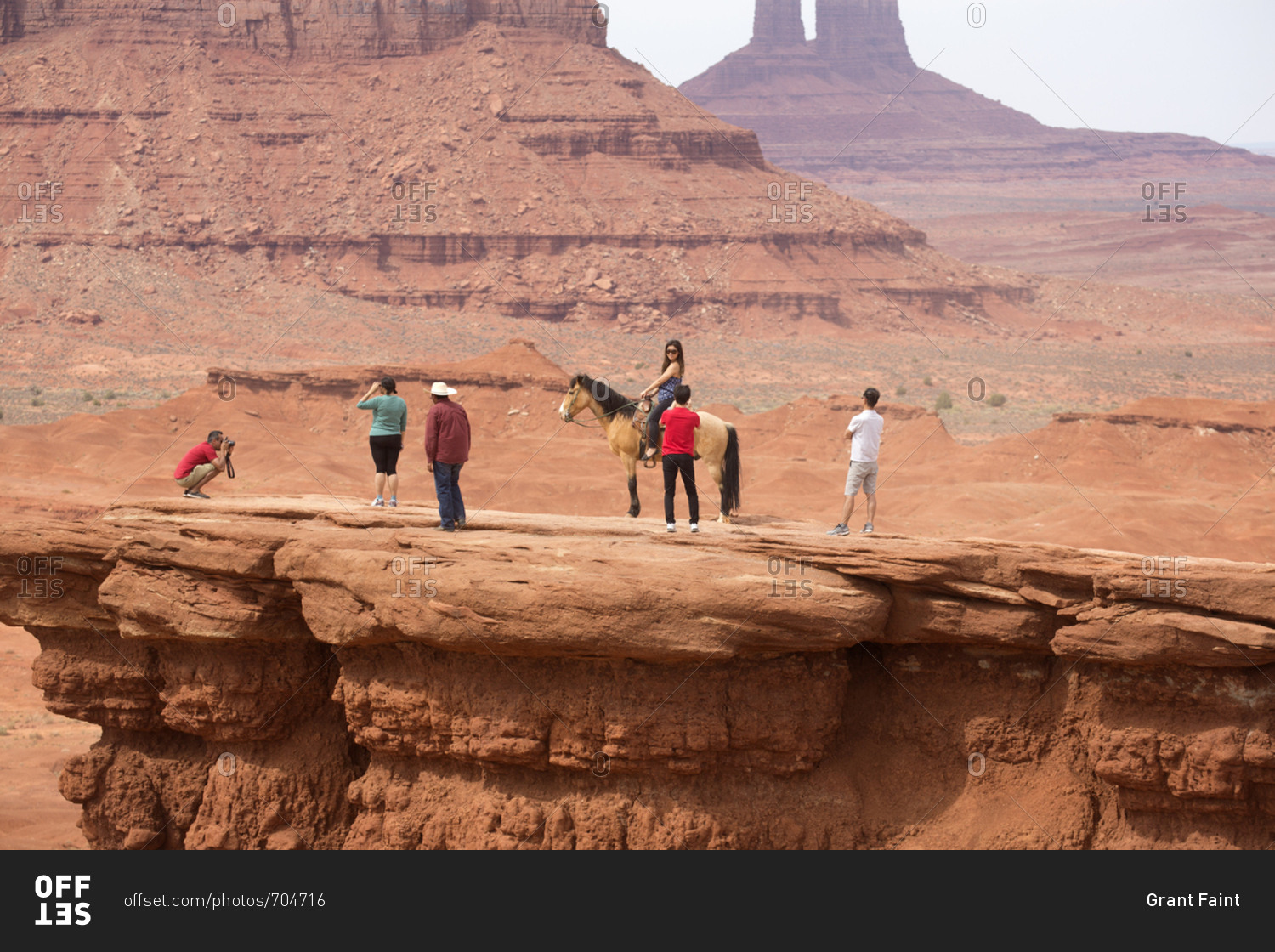 Monument Valley, Utah, USA - May 6, 2018: Tourists posing for pictures on mesa with American Indian and horse