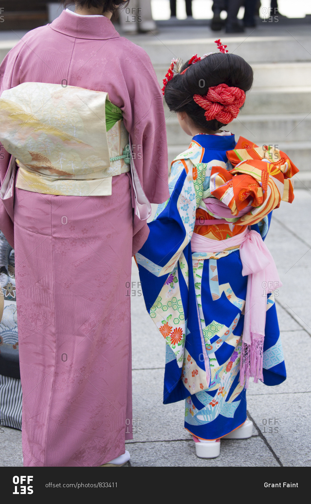 Mother and girl at Meiji Jingu shrine for prayers, Tokyo, Japan