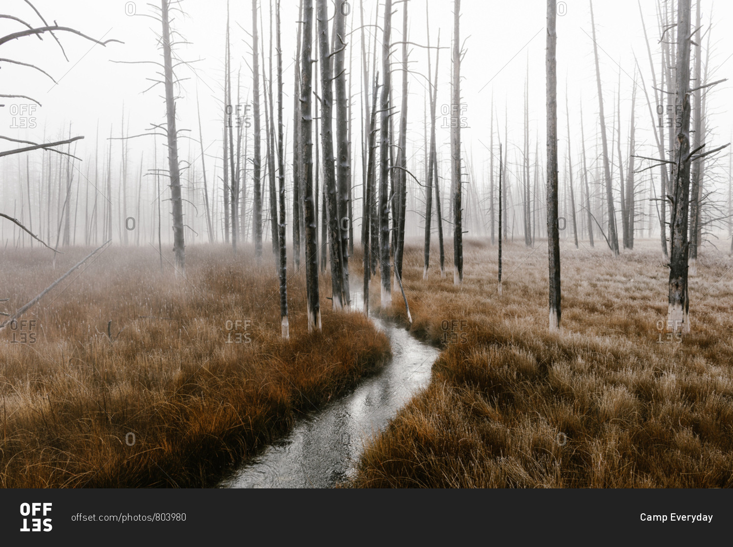 Narrow river in a foggy forest