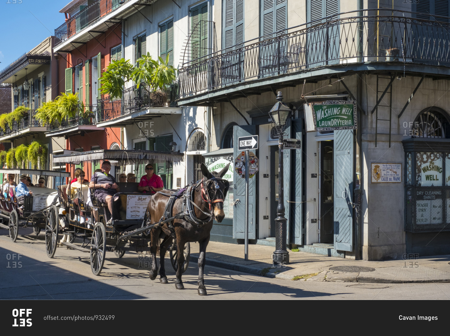 New Orleans, Louisiana, United States - October 13, 2016: Horse-drawn carriage and buildings on Bourbon St., New Orleans, Louisiana, United States