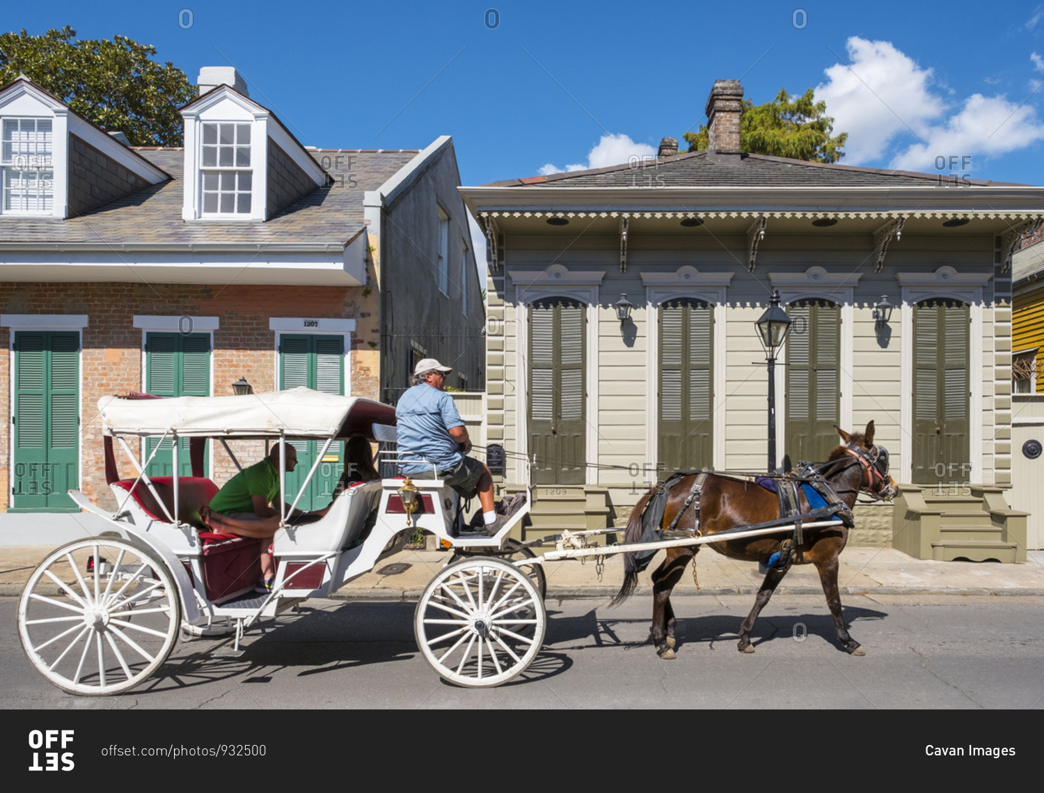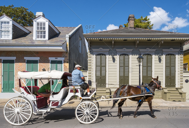New Orleans, Louisiana, United States - October 13, 2016: Horse-drawn carriage and buildings on Bourbon St., New Orleans, Louisiana, United States