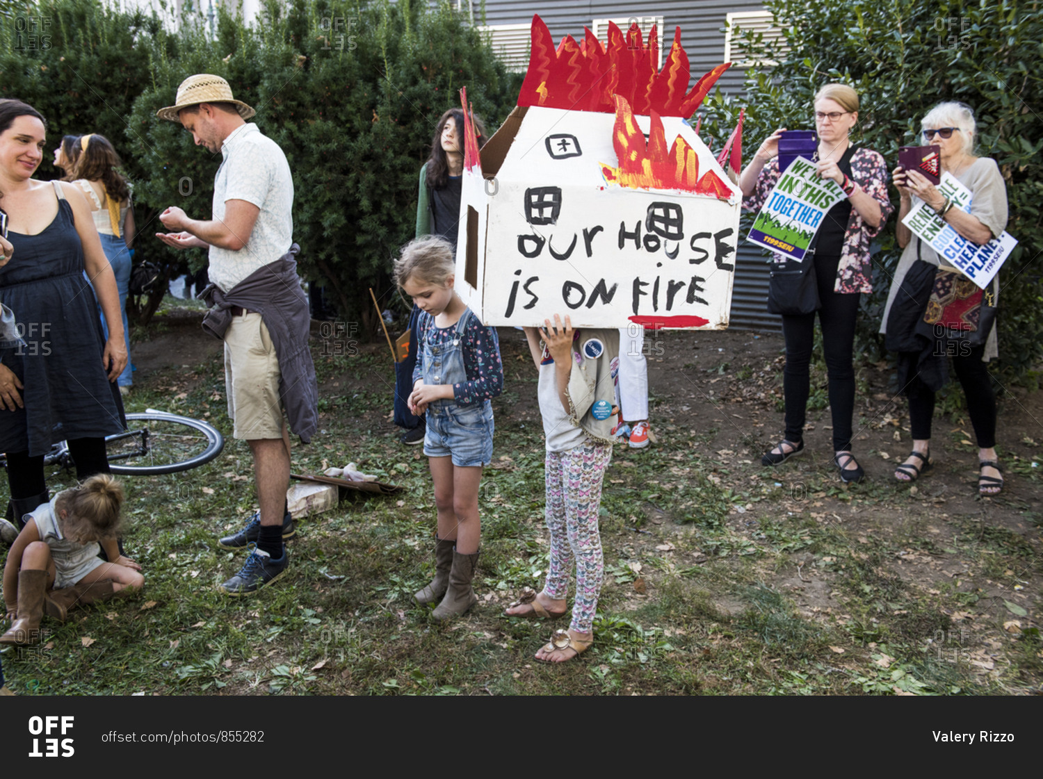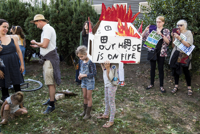 New York City, New York - September 20, 2019: Kid wearing a cardboard house that says "our house is on fire" at the Global Climate Strike