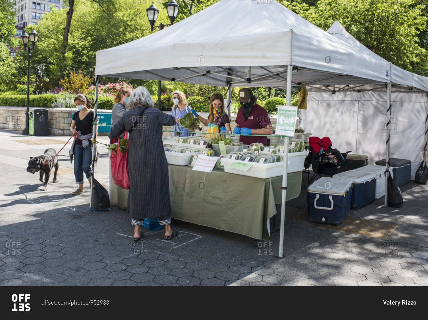 New York City, New York, USA - May 21, 2020: Farm Stand with farmer's and market-goers wearing masks and social distancing, Union Square Farmer's Market, New York City, USA.