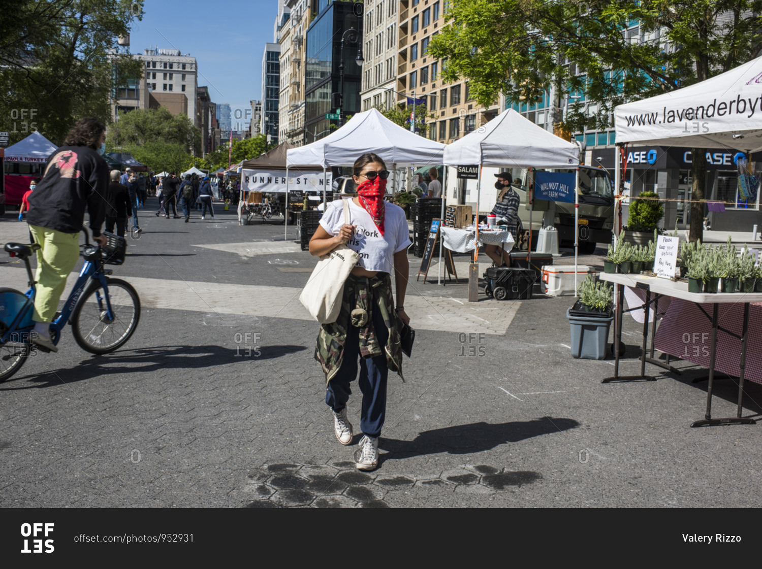 New York City, New York, USA - May 21, 2020: Market -goer wearing bandana as a face covering while shopping at the Union Square Farmer's Market, New York City, USA.