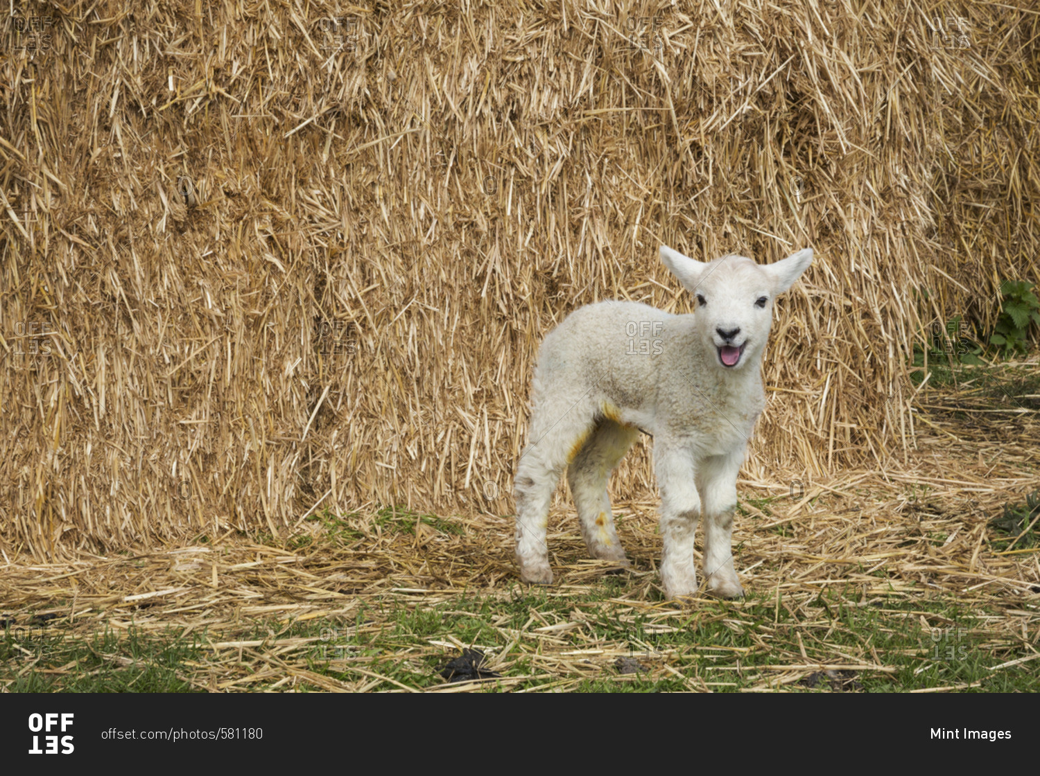 Newborn lamb standing outdoors in front of a large bale of straw
