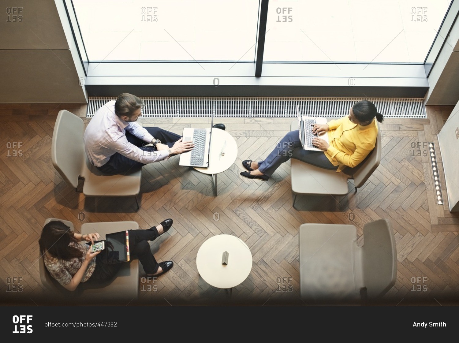 Office workers using devices in sitting area