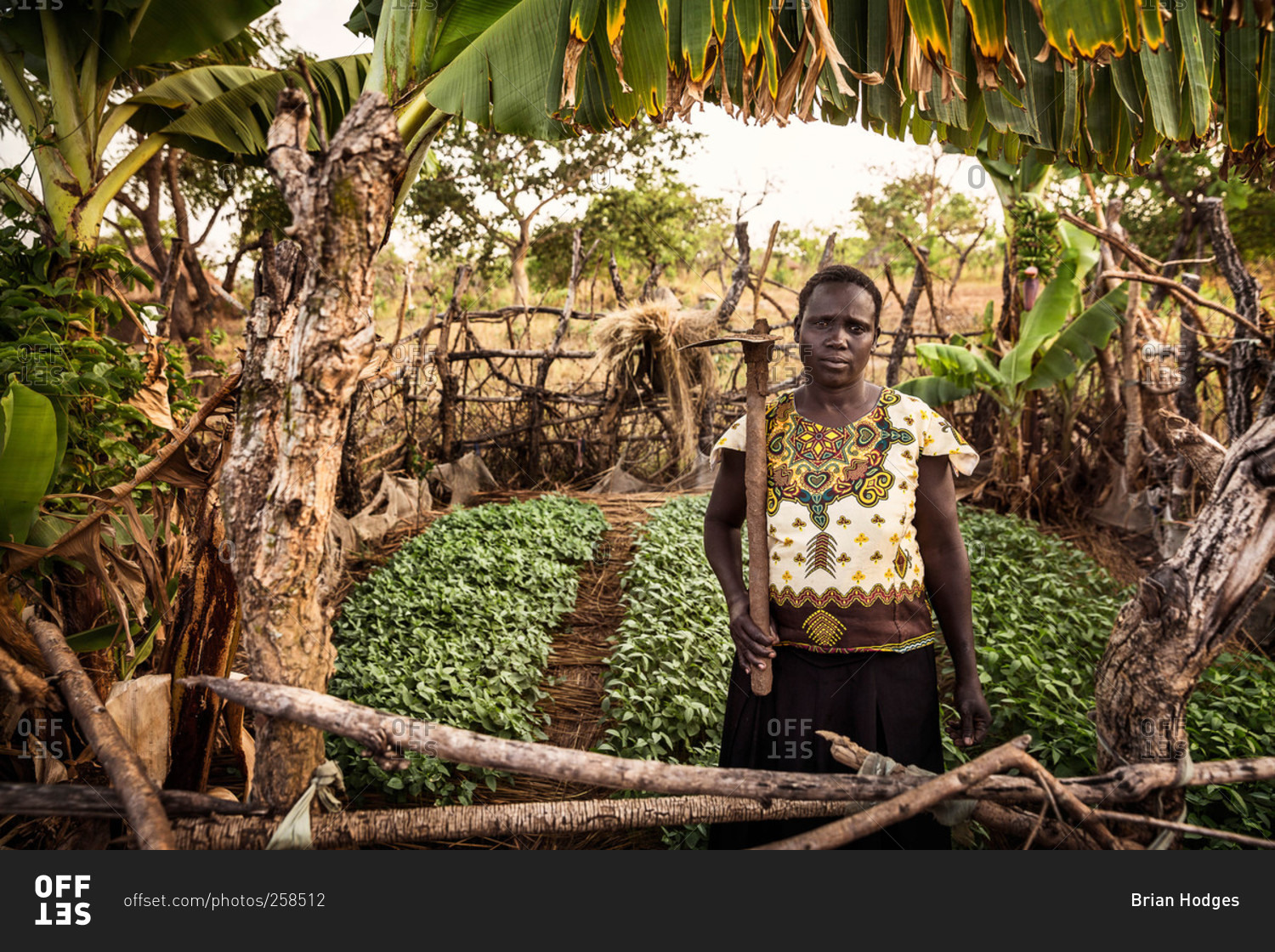 Omel, Uganda - March 3, 2015: Woman with a hoe standing in a garden