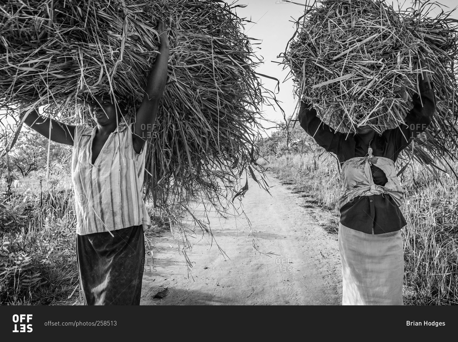 Omel, Uganda - March 4, 2015: Women carrying bundles of straw on their heads
