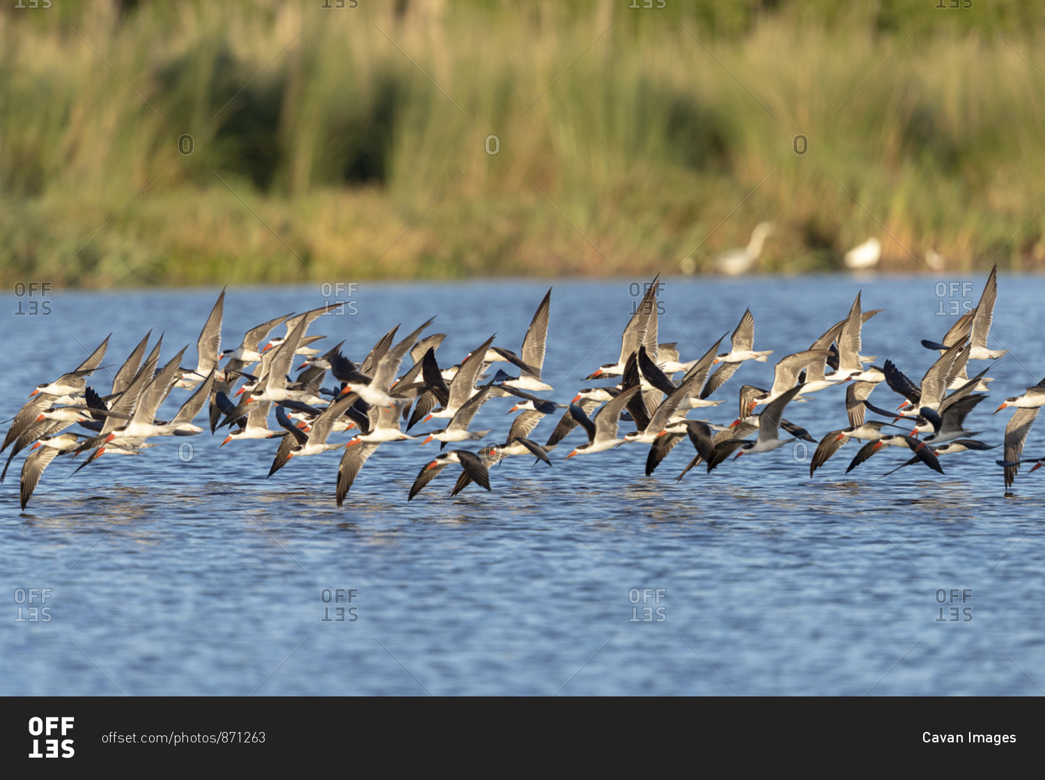 On a sunny day, african skimmers flies over a river