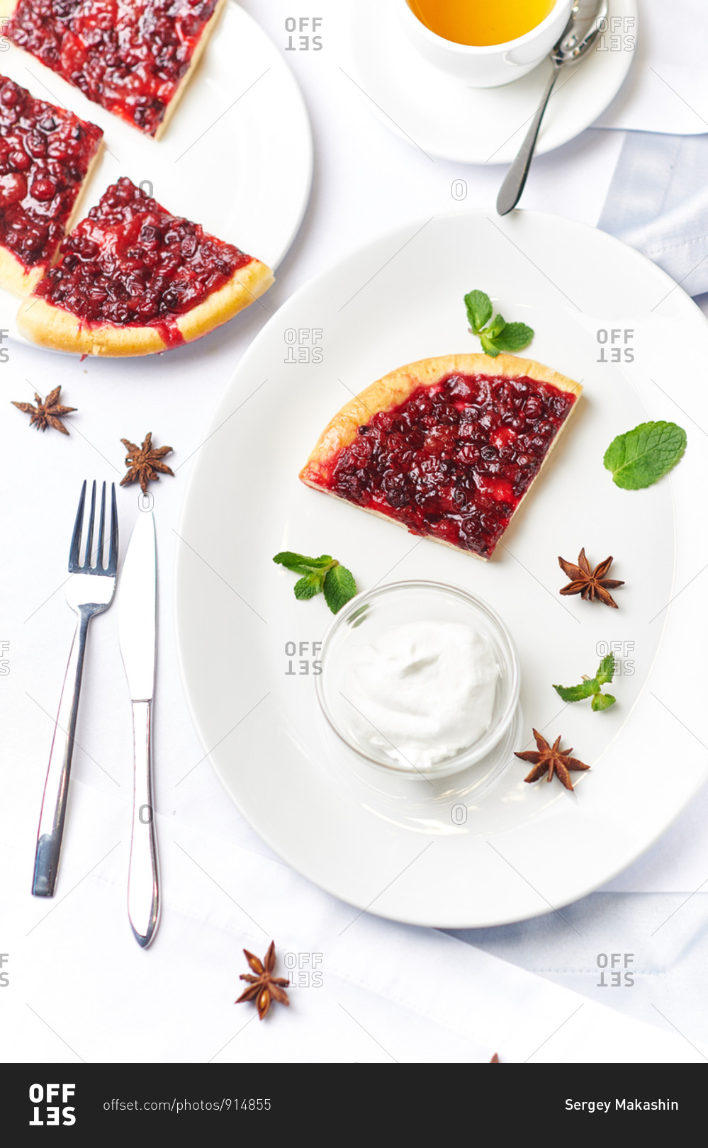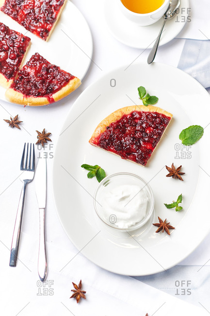 Open pie with cranberries and cranberries ice cream in a bowl