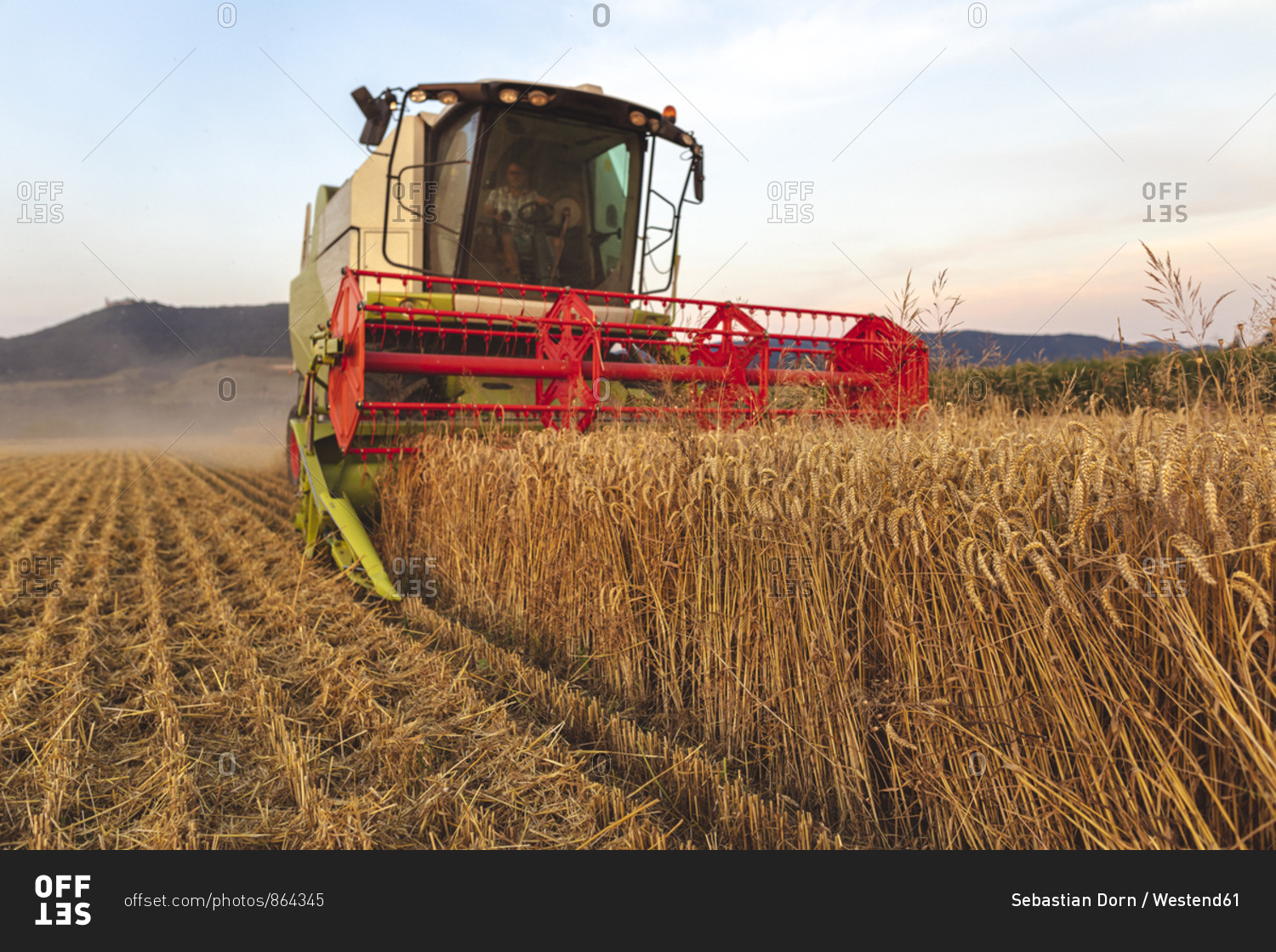 Organic farming- wheat field- harvest- combine harvester in the evening